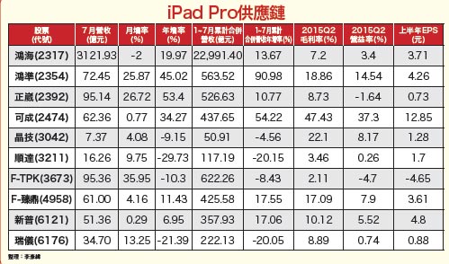 大尺寸iPad有望複製iPhone S系列熱賣市況預定九月中旬上市的iPhone 6S,硬體規格與iPhone 6相較下,新增「相機鏡頭畫素大幅拉高至千萬等級以上」、「相機鏡頭可能採雙鏡頭模組」、「內建新式壓力感測器」等嶄新應用功能配備,預料將再次掀起熱潮,重演iPhone S系列手機的銷售盛況。如此一來,勢必也將有很高機會可以為台廠iPhone 6S零組件供應鏈,帶來後市營收獲利大幅成長榮景,第三季八、九月份營收表現,也有機會因為蘋果提前拉貨效應,出現令市場意料之外的佳績,股價自然有望重回原本的多頭漲升軌道。預定年底前上市的蘋果大尺寸平板「iPad Pro」,將會因為螢幕尺寸加大至十二.九吋,明顯較前幾代iPad放大許多,預料將很有機會再度複製去年iPhone 6 Plus尺寸增大所帶來的熱銷效應,二○一二年iPad 3、iPad 4即曾因硬體規格大幅提升,出現五○%以上的出貨年增率。所以,隨著蘋果年度大尺寸iPad上市在即,預估有很大機會拉動相關供應鏈,受惠市場預期可成功複製去年iPhone 6 Plus上市熱銷效應,出貨量明顯擴增,股價有機會見到一波反彈漲勢。新台幣貶值有助出口競爭力 電子股如虎添翼另一方面,新台幣未來如能持續貶值(亦可視為另類「政策面作多」救市作為),自然有助電子股增強國際競爭力,推升後市營收獲利表現,甚至不排除有機會因匯率價差持續擴大利多,交出更好的營運成績,股價也就有望見到明顯漲勢。同時,如果新台幣貶值幅度可跟上甚至超越最大貿易競爭對手國貨幣貶值幅度,就可為台灣出口貿易商帶來最大業績成長助益成效。自然,股價表現也會因為反映營收獲利成長榮景,出現令人眼睛為之一亮的大波段漲勢。