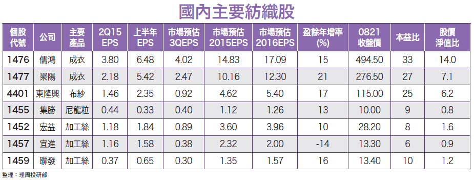 台股指數跌破短、中、長期均線,現階段在市場信心嚴重不足下,未來止跌回升的關鍵,乃在成交量是否擴增至千億水準之上,其中,尤以食品、紡織族群最有機會扮演反彈先鋒。台股近期遭受內外利空夾擊,指數持續破底,已跌破十年線(約七七五○點)重要支撐。細究原因,內部包括GDP面臨保二無望、證所稅議題以及總統大選將至的政治不確定性因素干擾;外部則有亞幣競貶,透露出大環境需求不振,還有中國紅色供應鏈衝擊台廠營運、美國升息議題,以及歐美股市重挫等利空,使得原本就屬淺碟型市場的台股震盪劇烈。台股空頭成形 未來何去何從?就技術面觀察,台股指數均已跌破短、中、長期均線,空頭市場儼然成形,另外周KD指標已跌破二十的超賣區且持續下探中,此現象於近年來實屬罕見,反映出市場極度悲觀的心理。現階段在市場信心嚴重不足下,未來能否止跌回升的關鍵,筆者認為必須看到成交量能持續擴增至千億水準之上,方可醞釀反彈契機。另一方面,即使是在空頭市場中的中期反彈,以指數目前跌幅約二千六百點來觀察,並以最弱勢的反彈○.三八二估算,指數至少也會有千點以上的彈升空間,屆時若個股掌握得宜,報酬也相當可觀,因此現階段無須過度悲觀,持股較低的投資朋友目前應當是積極尋找個股布局之時。台股各大類股中,目前僅有食品和紡織兩大類股指數勉強維持多頭排列,但在近期大盤持續重挫下,同樣出現補跌效應。紡織族群長線成長態勢明確就基本面檢視,在美股品牌大廠UA、Nike第二季財報表現亮眼,以及市場預期第三季財測也將順利達標下,目前訂單能見度至少可達半年,使台廠相關供應鏈成長態勢明確。筆者認為未來大盤落底反彈時,在解套賣壓相對較輕下,該兩大族群將最有機會扮演反彈先鋒,而紡織族群中,又以成衣和聚酯加工絲個股為市場焦點。台灣成衣族群近年受惠針織布終端應用增加,以運動服飾與女裝為主要產品,另外氣候變遷,引發對發熱衣和涼感衣等服飾需求增加,將帶動針織布市場持續成長。台灣業者雖面臨TPP效應以及中國廠商的大幅擴產競爭,但在產業整合能力與產品功能性、創新能力上,經過多年淬煉,已是全球機能性服飾供應鏈中重要的一環,產業地位已不容取代。根據Euromonitor預估,機能性服飾市場規模將由二○一五年的七七五億美元,成長至二○一八年的九二五億美元,年複合成長率達五.五%,其中,機能性服飾占整體運動服飾的四三%,占比相當高;在電子類股雜音甚多之時,長線走勢仍值得期待。機能布料引領潮流 成衣雙雄受惠儒鴻(1476)為國內彈性纖維布的領導廠商,屬於一貫化的垂直整合廠,產品可分為針織布事業與成衣事業,生產地區則以台灣、越南為主要生產基地。儒鴻從布料的開發、設計、生產均採垂直整合方式,主要成衣商品多為利基型產品,如運動服、休閒服,甚至瑜珈專用服飾,此類產品皆需客戶認證通過,具有一定進入門檻。由於儒鴻本身具有設計能力,加上在布料上不斷研發創新,能縮短交期符合客戶要求,除了成衣的量增加外,毛利也能有所保持,所以競爭力較強,近年營收和獲利受惠於生產效能提升,使得年複合成長率均達一○%%以上。聚陽(1477)為國內專業成衣製造及代工廠商,主要銷售區域以歐美為主,生產基地則遍布東南亞等地,包括有印尼、中國大陸、越南、菲律賓、柬埔寨等國家。聚陽近年受惠客戶UA訂單的持續成長,還有越南及印尼產能陸續開出,以及高毛利機能性服飾出貨比重增加,帶動營收、獲利增長。整體來說,成衣雙雄營收動能長線成長無虞,且籌碼相對安定,雖然本益比平均達二十五至三十五倍評價略顯過高,但隨近期出現補跌修正後,股價已逐漸進入合理區間,待未來若能修正至本益比二十倍以下,中期買點將浮現。聚酯加工絲三傑:宏益、宜進、聯發宏益(1452)為專業聚酯加工絲生產廠商,屬於紡織產業的中游廠商。聚酯絲依其用途可分為聚酯全延伸絲(FOY)、聚酯半延伸絲(POY)、紡延絲(SOY)等,就需求而言,以POY為最大宗。宏益上半年營收為一○.六六億元,年增率五.一三%,累計前二季稅後EPS一.八四元,乃聚酯加工絲族群中最高者,獲利成長力道強勁。宏益產品近年往高品質、高單價、高毛利的專業性產品生產為主,毛利率較能持續躍升。此外,公司間接為日本知名服務品牌UNIQLO供應長纖布,約有雙位數產能供給;不過由於第三季的淡季效應,市場預估獲利將略為下滑,第四季起在機台汰舊換新以及產量擴增下,可望重啟成長,建議不妨在營收淡季時布局。宏益近期股價正進行強勢整理,若突破下降平台整理區間,股價將不容小覷。宜進(1457)為聚酯加工絲、聚酯絲、聚酯粒、尼龍加工絲供應商,並以自有品牌「海鷗牌」和環保品牌「Green Guard」行銷。今年六月營收大幅跳升主要原因,乃合併宏洲(1413)營收的效應。展望下半年,在營收結構改變、產品組合調整以及垂直整合效益顯現推升下,三、四季營收將成長顯著,近期在大盤持續破底中股價已率先上攻。聯發(1459)為國內聚酯加工絲大廠,產品業務橫跨專業假撚及染整領域,今年第二季雖受季節因素影響,營收較首季略為衰退,但在產品組合改善與利基型產品提升下,毛利率仍略微上升,累計上半年EPS達○.六元。聯發近期受惠大客戶申洲國際(中國最大的成衣加工一貫廠)業績成長,訂單成長快速,去年底在看好TPP效應下開始至越南設廠,成衣月產能將
