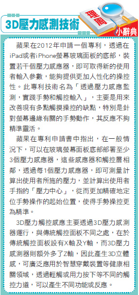 蘋果新的iPhone將會運用Force Touch(3D壓力感測器)技術,對於台灣供應鏈來說,包括利永環球科技、F-臻鼎、台郡、正崴、F-TPK與F-GIS,可望蔚為一片新藍海。科技始終來自於人性,這不僅是一句廣告詞,更是被蘋果(Apple)實際應用在產品當中。承接之前iPhone 5S首度採用Touch ID(指紋辨識感應器),開啟了Touch ID原本只有用在筆記型電腦上的新應用後,這次蘋果的新技術─Force Touch(3D壓力感測器),於Apple Watch之後,也會應用在iPhone上面,對於台灣供應鏈來說,將是一片新藍海。儘管台灣零組件廠商一直是蘋果供應鏈中相當重要的一環,不過近年來,蘋果執行長庫克(Tim Cook)積極實行培養中國供應鏈的策略,這不管是為了因應中國已經是蘋果最大市場,亦或是純粹為了成本因素,總而言之,蘋果等於台灣供應鏈的「等號」,已經越來越淡薄。面對已經相對成熟的零組件,台系廠商只有透過新的技術、新的應用,才能擺脫中國廠商的追擊。蘋概股新看點:3D壓力感測器蘋果新iPhone已經推出,姑且不論其未來的銷售量是否能夠突破前一代iPhone 6及iPhone 6 Plus所立下的障礙,對台灣廠商來說,蘋果之所以為蘋果,在於其每一代新產品都能有引領市場的發展技術,而根據不同的新技術,往往都會有新的應用跟著出現,而目前最夯的正是3D壓力感測器技術。壓力感測器被業界喻為是iPhone有史以來最大的人機介面改變,且繼Apple Watch及Macbook後,一旦蘋果的主力iPhone產品也開始採用,需求量將明顯大幅成長。3D壓力觸控功能就類似快捷鍵,只要使用者長按螢幕上的圖示,就會直接開啟相關應用程式的功能,例如長按地圖,就能啟動導航功能;若長按歌曲,就會出現選單,可存入播放清單等等,這也是蘋果針對3D壓力感測器所內建的基本功能。產業人士分析,包括筆記型電腦、平板電腦和智慧型手機,這些產品所使用的觸控技術,都可以感測到使用者所施力的「方向」,卻無法感知使用者按壓了多大的力道,也就是「深度」,而如果可以感應深度,就可以有更多的操控變化。在Apple Watch中,蘋果裝置了一個名叫「Taptic Engine」(直線步進馬達)的表面感測器,它能夠感測使用者的力道與面積大小,並且根據內設的功能,將這些按壓轉換為震動互動,包括使用者的手指及手腕感覺,甚至可以將這種感覺傳遞出去給其他人。TapTic Engine的特點在於,當Apple Watch收到提示通知,或是使用者轉動錶冠、按壓液晶螢幕時,能發出適當的觸控回饋,就好像真的有人用手指敲擊使用者的手腕一樣,可以及時收到通知並做出回應。此外,它還能把使用者不同力道的點擊做出不同的「訊息回應」,透過內建的TapTic Engine,轉化為一般的輕撫、敲擊、觸碰等不同手指動作,傳送到朋友、家人身上,讓即使遠在他方的人,也能感受到使用者對他們的碰觸。