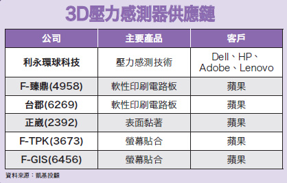 蘋果新主打 六家台廠可望受惠分析台灣供應鏈中,目前與3D壓力感測器相關的廠商,最下游的是環泥(1104)旗下的利永環球科技,負責軟性印刷電路板則有鴻海(2317)旗下的F-臻鼎(4958)以及台郡(6269),另外表面黏著技術的有正崴(2392),負責螢幕的有F-TPK(3673)與F-GIS(6456)。這些廠商,當然並非全部都是蘋果供應鏈,不過隨著3D壓力感測技術成熟,皆可望受惠。利永環球科技原本是國內傳統產業集團企業中,環球水泥旗下的電子事業部門,二○一○年從工研院技術移轉、新創成立。利永環球執行副總侯智升也是技術的研發人員,從工研院旗下原本只有一個人的專案,逐漸擴大,到最後技轉獨立。利永環球科技最早將這項3D壓力感測技術,用在行李箱測重,只要旅行者握著顯示器,再舉起行李箱,就可以測出行李箱的重量。後來,侯智升又把市場轉到電子琴、電子鼓等,玩家可以根據不同的演奏力道,發出不同的聲音變化。接下來,侯智升將目標逐漸轉到消費性電子產品領域,包括裝有3D壓力感測器的觸控筆,即能達成原本要用畫筆才能達成的筆觸效果。儘管蘋果3D壓力感測器主要訂單是下給美國廠商ADI(Analoge Device Inc.),但是非蘋陣營中,利永環球科技仍有不錯的市占率,目前包括筆記型電腦廠戴爾(DELL)、惠普(HP)、聯想(Lenovo)、軟體廠奧多比(Adobe),都有採用利永環球科技的3D壓力感測元件。F-臻鼎、台郡 軟板營收豐隨著智慧型手機越來越輕薄,在內部空間的有限限制下,軟性印刷電路板的需求勢必有增無減;而蘋果這次採用新的3D壓力感測器技術,軟板廠F-臻鼎和台郡亦是最主要的受惠廠商。據了解,iPhone 6所使用的軟板用量,平均每台的價格大約已有二十美元左右,而這次的新款iPhone所使用的軟板更多,同時也要求更高,因此初估每台所使用的軟板價格,較前一代機種大增了四○%,也就是高達二八美元,這對於F-臻鼎或台郡來說,不管是營收還是獲利,都將是一顆大補丸。反映在營收上,從F-臻鼎公布的數字來看,八月營收已經從七月的六一億元,躍增到七二億元,月增率達一八%,較去年同期成長二二%。法人推估,F-臻鼎九月營收有機會回升到八十億元以上的旺季水準,預估第三季單季營收將上看二三○億元,季增率超過二○%,毛利率也將回升到一八%以上,單季每股稅後盈餘將達二.六元。而且這樣的營收高水位也可望延續到第四季,甚至是明年一月。F-TPK、F-GIS指望蘋果大單至於在觸控面板廠部分,包括F-TPK與F-GIS也都陸續嚐到了3D壓力感測器的甜美果實。F-TPK八月營收創下今年單月新高,也重回到一一○億元大關以上,月增率達二三%,年增率亦有一二%。F-GIS八月自結合併營收達八七億元,月增率三五%,年增率三八%;法人表示,F-GIS七、八月營收已達一五一億元,以此推算,第三季營收非常有機會超過公司預估的二三一億元。只不過,F-TPK雖然營收終於回升,但是去年因為痛失蘋果iPhone訂單,不僅獲利大幅滑落,每股稅後盈餘從二○一三年的二一.九元,掉到僅剩○.八元,今年上半年的營運更是出現大幅虧損,每股稅後虧損達四.七九元。顯示只要能吃到蘋果單,可望對營運形成一大助益;然而,對F-TPK來說,下半年才開始靠著3D壓力感測器重新回到蘋果供應鏈的行列,能不能挽救上半年紅字的成績單,仍有待觀察。至於F-GIS則有凌駕F-TPK的趨勢,不過F-GIS之前最大的壓力是來自於中國廠商的競爭,如今好不容易找到3D壓力感測器才稍能喘口氣,就看接下來旺季能否真的旺起來。