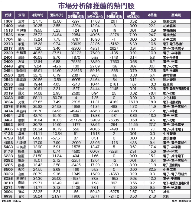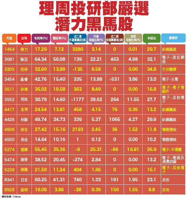 本期聚焦「雙率」─毛利率、營益率表現優異、籌碼穩定度升高,得力、聯亞、矽瑪、金洲、利勤、崇友、勝麗、日友等個股。大盤近期在市場空方再度肆無忌憚下,自短線高點八四八八點回檔修正以來,最多一度達四二七點、五.○三%跌幅;指數亦因此回落至十日線、月線之下,形成一個明顯的極短線空方格局。短線可能探底 中線多方仍大有可為然而,就台股中期走勢而言,依舊為自國安基金出手護盤,七二○三點強彈大漲以來,強勢作出的中多格局未變。短線或有持續回檔探短底可能,中期來看,場上多方仍大有可為。本周理周投研部精選鏢股,不僅於法人在布局卡位時,最重視的「毛利率、營益率」雙率數字表現優異,更因近期股價隨大盤回檔修正而下跌,本益比有機會回到合理區間,獲法人青睞,進場撿拾便宜;後市亦可望受惠傳統旺季屆臨、產業基本面持續好轉、營運前景展望透明度仍高、營收獲利成長動能強,有機會走出一波亮眼漲勢,計有:得力(1464)、聯亞(3081)、矽瑪(3511)、金洲(4417)、利勤(4426)、崇友(4506)、勝麗(6238)、日友(8341)等。財報數字「雙率」表現佳、產業前景展望透明度高、營收業績成長潛力強,外資及投信法人紛紛搶進布局、籌碼穩定度升高,適合進場布局操作鏢股有:利勤、崇友、勝麗等。利勤、崇友、勝麗財報佳、成長動能強 法人進場卡位利勤(4426):紡織業針織布產銷專業廠,受惠Adidas、Nike、Reebok等全球知名運動品牌廠代工下單量持續穩定增加,今年營運成長性受市場人士高度期待,中長期看好買盤持續進場低接,近期股價相對大盤強勢。八月營收一.六八億元,月增率一一.一五%,年增率三○.四九%;累計一~八月營收一三.三○億元,年增率高達五九.二三%。同時,上半年EPS為三.六五元,已超過去年全年獲利總和;加上與全球各大知名品牌共同合作研發成功布料材質未來發展潛力深獲產業人士肯定,法人對其下半年營運前景深具信心,展望透明度高,預估其今年度營收、獲利很有機會創下近三年以來新高。崇友(4506):電梯及電扶梯維修保養專業廠,受惠目標市場以萬台為單位的電梯維修保養服務商機成長,帶動營收業績表現搶眼。八月合併營收達三.五億元,年增率大幅成長達五一.五八%;累計今年前八月合併營收三○.○四億元,年增率四二.八九%,創下歷年同期新高。近年因國內辦公大樓、飯店等商用建築,對電梯之安全性、穩定度、運行速度等需求不斷拉高,帶動崇友營運穩定成長。此外,崇友也同時持續受惠國內電梯安全意識不斷提升,以及內政部推動電梯安檢法規,所帶動持續增溫的老舊電梯汰舊換新商機,法人預估,崇友上半年接單裝機量已超過千台以上,預計全年可持續維持二千台以上。目前維修保養電梯則每年約達三.一萬台。展望今年營運,法人預估,崇友全年營收挑戰歷年新高機會很高。勝麗(6238):半導體記憶體IC產銷通路廠,旗下子公司勝開科技已順利取得記憶體、CMOS影像半導體元件之封裝、測試技術及專利。八月營收二.一三億元,年增率大幅成長達三八三.八%;累計前八月合併營收達一六.一八億元,年增率大幅跳增達一.一倍。上半年毛利率亦跳升達二二%,EPS達二.九九元,大幅超越去年全年水準。由於全球最大汽車市場美國已通過立法要求所有行銷車廠自二○一六年起,新車均需標配「攝影鏡頭系統(CMOS為其中一種)」,至二○一八年底則要進一步全面性擴及所有上市車款,預估每年最多將可新增高達一千五百萬套CMOS鏡頭系統,商機超過七億美元以上。勝麗目前主要客戶為安森美半導體旗下影像感測元件廠Aptina,為國內CMOS應用產品元件廠少數成功打入汽車大廠供應鏈業者,未來可望隨著美國車市政策商機蓬勃發展,業績跟著水漲船高。分析師亂帶會員搶股票 小心買到跳水股市場分析師最近仍積極把握每一次難得的機會,持續帶會員進場衝鋒搶短。細看這些個股,可以發現,簡直是胡挑瞎買,連一些營益率為負值、EPS為負值而算不出本益比,或是因籌碼落在有心人手中,運用既有造市優勢,本益比已明顯偏高者也在其中。更有的是股價已脫離產業合理本益比區間、法人站在賣方者,如:新纖(1409)、友達(2409)、晶電(2448)、亞光(3019)、網龍(3083)、華亞科(3474)、群創(3481)、晟德(4123)、雙美(4728)、聚和(6509)等,這些基本面前景展望透明度不高、財報欠佳、外資與投信選擇站在賣方、空方勢力明顯居上風的個股,後市怎有上漲機會?光明一個月報酬率25%「大數據鏢股」自752期以來推薦的嚴選標的中,截至9月25日,有20檔個股波段報酬率達2成以上,其中,佰研(3205)累計波段報酬率更高達215.02%!對比大盤指數、櫃買指數、台灣50等盤面觀察指標,同期間曾出現最大漲幅分別為7.08%、8.78%、7.95%,鏢股群精彩表現,有目共睹!同樣為本波大盤自4月下旬萬點反轉下殺,回檔最深達2811點、跌幅最高達28.07%以來,5月下旬買進個股─智基(6294),也繳出大漲28.54%的亮眼成績!而萬點反轉下殺前所買進個股,歷經幅度如此的震撼教育後,得力(1464)、和大(1536)、巨庭(1539)、錩泰(1541)、台光電(2383)、弘塑(3131)、光環(3234)、同致(3552)、東隆興(4401)、利勤(4426)、江興鍛(4528)、F-聯德(4912)、F-IET(4971)、華星光(4979)、智晶(5245)、旭隼(6409)、宏捷科(8086)等17檔個股,仍能繳出2成以上漲幅的漂亮戰果,近期亦見強攻反彈亮眼漲勢,大數據鏢股漲升實力之強可見一斑!