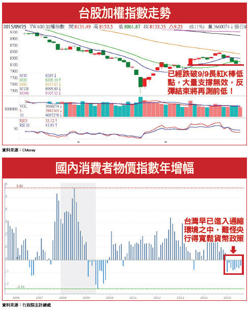 無論是國內即將面臨的金融危機,還是國際上層出不窮的風暴事件,都在告訴讀者:當美國升息緊縮資金之時,全球金融市場風險將不斷升高,所以現金為王,或是向下操作,才會是贏家。讀者若仔細留意全球近期以來金融事件的發展,大概可以窺見國際間所醞釀的金融危機一觸即發,一旦爆發,其規模應該會大於二○○八年金融海嘯。筆者一直以來都在提醒大家要留意這波台股跌深反彈,對市場投資人打的暗號就是─「快逃」!原因就在於從台股周K線的角度來看,八五○○點的大頸線位置在這波台股反彈中並沒有被站上,同時還在約略靠近季線附近的地方出現套牢壓力;再者,九月九日挾著超過一千一百億元成交量,所拉出的長紅K棒也已經被突穿,說明這個位置的買盤是虛的,並且一點支撐都沒有。以量價結構的慣性來觀察,台股自八月二十四日反彈以來,量增便是攻擊,量縮則是橫盤整理,關鍵轉折在九月十八日的收盤前五分鐘,出現超過一百八十億元的空方殺力道,讓量縮就是橫盤狹幅區間整理的慣性,在九月二十三日出現改變,雖然量增幅度不大,卻可以說是在整理結束後,對於方向做出帶量表態的向下宣告。國內正進入通縮環境當中,實質利率大於名目利率。上周國內央行理監事會議出乎市場預料之外,宣布降息半碼,使得過去連續四季都不動如山的利率出現變化,這個舉動正是向投資人宣告一個訊息:為了避免國內進入通縮環境,央行採取了擴張性的貨幣政策。央行降息宣告國內通縮一般來說,擴張性的財政政策目的是為了把資金逼迫到市場當中做投資,以總體經濟學的角度而言,是讓更多資本投入產業升級,進而讓產出以及所得能夠獲得提升,並且讓物價水準得以上升,達到解決通縮的問題。但是近期在新台幣出現連續性重貶的同時,央行又再次調降利率水準,勢必會讓新台幣貶值的情況加劇,甚至可能再次擴大外資匯出規模,這對台股未來的走勢而言,不啻蒙上一層陰影。一直以來,國內產業界在外銷進入僵局的同時向央行喊話,希望讓新台幣貶值才能夠提升出口競爭力,其實這種做法就是犧牲消費者的購買力,來補貼外銷產業的行為。而以今年為例,新台幣貶值的情況相當明顯,卻也沒見到外銷訂單成長,反而到八月為止呈現連續五個月負成長,且出口數據同樣從下半年開始出現大幅度的負成長,這樣還要說新台幣的升貶與外銷競爭力有絕對關係嗎?筆者觀察,匯率才是一個國家由盛轉衰的領先指標。每次新台幣出現重貶之後,台股必定伴隨著一波回檔,這次新台幣已經貶破三十三元大關,創下六年以來的新低,也快接近金融海嘯時的水準,當時,新台幣貶到三十五元兌一美元,因此台股可能再次面臨一波不小的海嘯。
