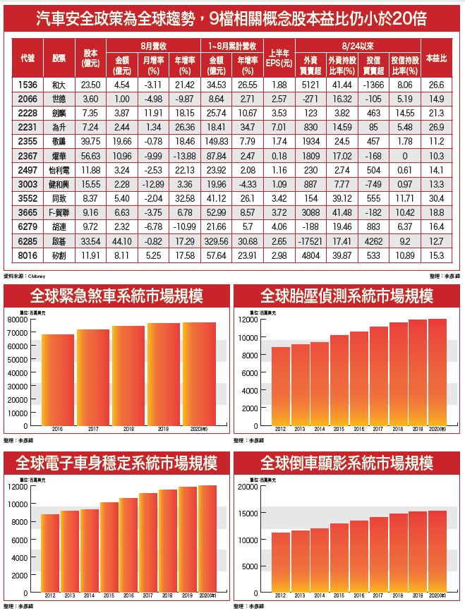 就外資近期進出動向觀察,十月份台指期於轉倉換新月合約後,目前留下二萬口以上淨多單留倉;同時,台積電(2330)目前股價走勢也已領先站回至中期重要參考均價線季線之上,有機會發揮穩定軍心效果,帶領其餘大型權值股跟進衝高,推升大盤指數持續上漲,續創本波自七二○三點強彈波段漲勢以來新高點。汽車安全政策將上路 供應鏈後市看漲受惠產業傳統旺季效應、主要工業國家汽車安全政策規範,以及節能減碳訴求,電動車逐漸興起等,各項有利汽車安全設備供應鏈、電動車零組件產業發展因素陸續上路,相關供應鏈近幾個月以來股價相繼見到三至七成不等的亮眼漲幅。同時,儘管全球車市整體市況發展預估仍將以持平表現可能性居高,但由於各式汽車安全相關限制、規範政策已先後於主要工業國家施行,不僅有助擴大產值規模,更有利台廠在未來幾年內大啖商機,大發利市。歐股後續仍有可能因為「福斯事件」延燒、歐洲知名車廠恐遭波及,持續下修、探底,繼續現有明顯偏空走勢型態。市場仍擔心可能面臨系統性風險加上受中國經濟成長力道衰退拖累、歐元區通縮陰影籠罩,以及近幾個月以來歐元升值抵消掉一定程度歐洲QE刺激景氣復甦效果,美國聯準會仍有可能於年底前宣布升息間接影響,知名信評機構標普首席經濟學家即預言,歐洲央行未來幾個月內很有可能為了解救歐元區經濟成長率免於深陷泥淖,宣布延長現有歐版QE至二○一八年中,屆時,整體QE施行規模預估將高達二.四兆歐元!全球原物料大型商品交易商嘉能可(Glencore),近期因施行各項大幅削減債務規模舉措,其作為卻不受投資市場認同,導致股價大幅下跌一事,由於嘉能可未來可能遭大型信評機構將其現有「投資級」評等大幅調降至「垃圾級」,因其所涉及商品信用交易業務範圍廣泛,往來對象遍及全球,同時,根據公司發布,預估淨債務部位金額高達三百億美元,一旦面臨「投資評等大幅下調→融資能力大降→破產倒閉可能性高」風險衝擊,其影響規模不僅較雷曼兄弟事件更加龐大,也將對全球金融資本市場帶來更加嚴重的影響。