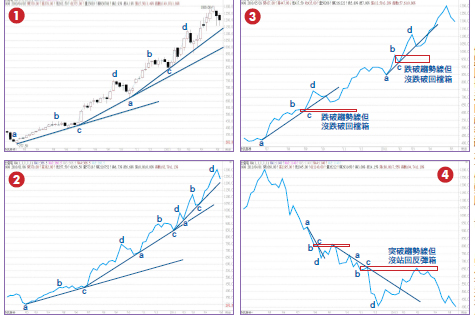 在N字與波動的形成,我們發現出現a和c這兩個低點,經常被使用來畫趨勢線,研判多空趨勢方向、斜率和速度,上升趨勢線的畫法就如圖一的a和c兩點的連線或c和a兩點的連線,驗證任何上漲或下跌的走勢,其基本元素就是N字所組成。上升趨勢線從兩個低點形成一條斜線,斜線就有角度並指引方向,角度告訴我們,隨著時間推移若要維持這角度上漲就應該要往上漲多少空間,因此上升趨勢線是可以研判股價力道是否減弱的一種方法,但並非跌破上升趨勢線趨勢就會反轉。由圖一發現三條上升趨勢線後面的比前面的陡峭,告訴我們股價走勢多方力道越來越強。但是有畫過趨勢線的朋友都知道,有時候會有很多低點,要取多少低點所切過的趨勢線是一個難處,也經常因人而異,這是在趨勢線上很多初學朋友較困擾的地方。同樣的線圖把它改成由收盤價所連線(圖二),可以更輕易找到圖中的低點,且可以比較第三條趨勢線,股價於圖一還沒跌破第三條上升趨勢線,但圖二收盤線圖卻提早就跌破了,後面的趨勢若是反轉,投資人可以更早減碼與出脫。我們觀察到在上漲過程中的回檔箱是最重要的看盤重點,由於修正有兩種模式:一種為空間上的修正,賣出之後還有價差可以買回;另一種是時間上的修正,就是以盤代跌,因此經常賣出之後還要再用更高的價格去追回來。從圖三可以找出a點和c點來畫趨勢線,但讀者可以發現當跌破趨勢線之後,股價卻沒有出現較大的回檔,後面再創新高又要用高價追回來。在一般的書籍會稱這是假跌破訊號,但觀察發現要有較大的空間修正,就會跌破b、c這兩點所形成的回檔箱,因此這也證明跌破趨勢線並非趨勢反轉。圖四為宏達電下跌走勢的周線圖,我們可以找到a、b、c、d四個點形成倒N,畫a和c這兩個高點為下降壓力線,當突破下降壓力線時不代表會有較大幅度的空間反彈或回升。因此若使用下降壓力線作買賣訊號,很容易在盤整盤或下跌中繼站虧損,若用下跌的b、c段當作反彈箱,只要沒有站回反彈箱頂則趨勢不會被扭轉,如圖四的第二個反彈箱,可以很清楚的看到反彈於此就是空頭走勢的最佳空點,接下來有很多反彈箱(回檔箱)簡單實用的方法,再請讀者繼續研讀下去。