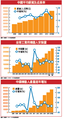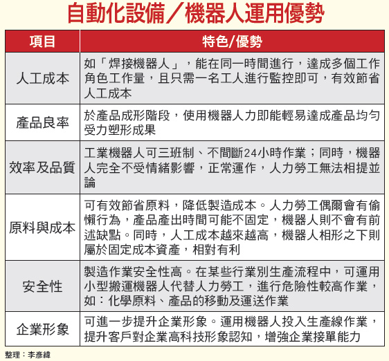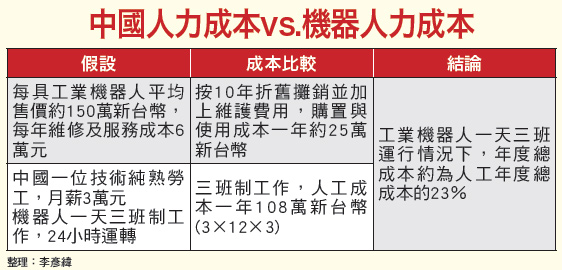 少子化推波助瀾 自動化機械應用蔚為風潮因為「少子化」已成無法逆轉的人口版圖發展趨勢,對重視長遠發展規劃的企業主而言,更須將之視為一項嚴肅課題,及早作好相關因應對策,將其納入規劃企業全面性人力資源發展政策時的重要課題。因此,「自動化機械勞力」的運用,也就成為企業主們最方便有利的選項。目前已成為全球第二大經濟體的中國,目前也正因人口老化速度加快而大為恐慌,據聯合國「世界人口前景二○一○修訂本」按高、中、低三種生育率方案,對中國大陸人口成長率所做預測。按照中方案,中國人口將於二○二六年轉為負成長,之後速度加快,直至二○六○年才可能穩定下來。很明顯的,「自動化機械勞力」的準備及運用,當然也就成為官方於規劃人力短缺可能對經濟、產業、軍事層面帶來衝擊的因應對策時,重要的選項之一。另一方面,根據中國「Wind資訊」的統計數據指出,中國人工平均薪資自二○○六年將近十年以來,平均上漲增幅為一四%,預計今年亦將維持一二%以上增幅,此一薪資情勢發展結果,只會更降低企業營運獲利能力。同時,一旦員工對於薪資福利提升幅度持續不滿意的話,缺工情勢恐怕會愈演愈烈。以中國而言,配置機器人的平均成本,僅達人工勞力成長二三%。根據BCG(波士頓諮詢公司)預估,下一個十年內,中國工業機器人相關投資金額將會大幅增加,預計將自目前的平均二%至三%年增率,進一步成長至一○%。