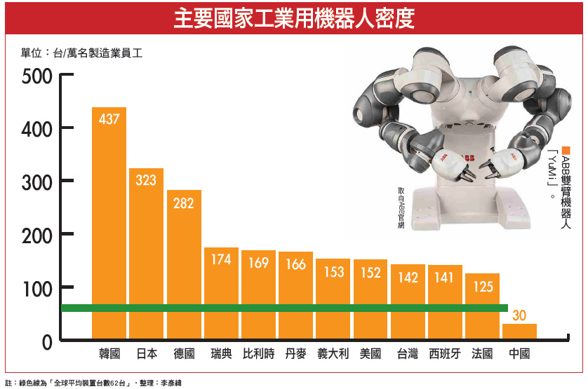 自動化效益驚人 將成中國製造業主力部隊機器人大量投入製造業結果,預測到了二○二五年底,能為中國整體製造業省下平均一八%的勞動成本,人均勞動產出值預測亦將可進一步拉升一○%至三○%以上。同時,如果以每一萬名製造業員工所對比機器人安裝數量,來計算產線應用自動化密度,目前全球平均裝置數為六十二台,日、韓兩國自動化密度最高;相形之下,中國僅有三十台,遠遠落後全球自動化平均值,後市潛在成長空間仍相當大!再以中國官方原本設定,製造業自動化發展長期要達成的戰略目標─「躋身世界製造強國領先集團」來看,中國要追趕上世界工業自動化製造強國─德國、日本、韓國自動化密度平均裝置台數三四七台,顯然還有一大段的距離。