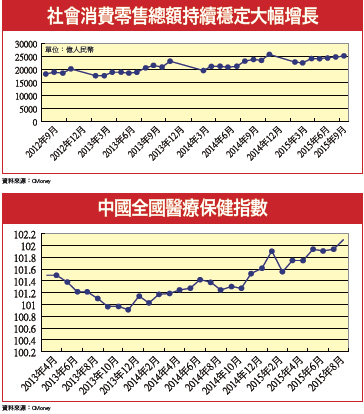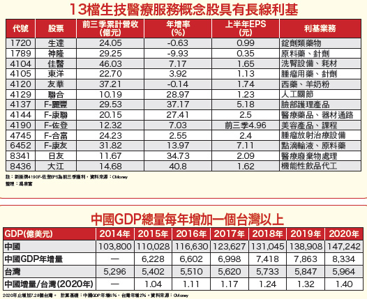 從十三五計畫推敲,台商在醫療服務、消費升級領域有相當優勢,其中生技股營收來自中國大陸,並積極布局投資或策盟者,投資人可密切追蹤。高速成長的巨獸,內分泌失調,需要調結構,調整過程將影響全世界,有壓力但也帶來機會,消費市場將是成長重心。Q3中國GDP增速新低 換個視角仍驚艷十月十九日中國官方公布了第三季的GDP與九月的實體經濟數據:第三季GDP年增為六.九%,創下二○○九年第二季以來的新低,但優於市場預期的六.八%,若與第二季比較則為季增一.八%;經濟增長速度雖創新低,但投資人需要留意的是,基期的不同,我們需要用不同角度思考。二○○九年中國的GDP總量為三三.五三兆人民幣,而二○一四年中國的GDP總量已來到六三.六四兆人民幣(約當十.三八兆美元),以這樣的體量規模,只要能成長五%以上,都應該肅然起敬。以台灣二○一四年的GDP為五二九六億美元為基準,中國大陸只要GDP成長五.一%,總量就等於多一個台灣;假設今年到二○二○年中國大陸都能保持六%的年增長,台灣GDP保持二%的年增長基礎,則二○二○年中國GDP總量將增加七.二八個台灣,沒錯,就是增加超過七個台灣,更何況台灣增長二%都仍須努力。每年GDP總量增加超過一個台灣的怪獸,必然會內分泌失調,難怪需要調結構,這個調整過程,必將影響全世界。這種巨獸就在我們旁邊,我們能不認真面對嗎?中國未來GDP年增率六~七%是新常態,而且主角互換,第二產業(製造、建築)下,第三產業(服務)上,資本市場部分板塊仍存在誘人的投資機會。