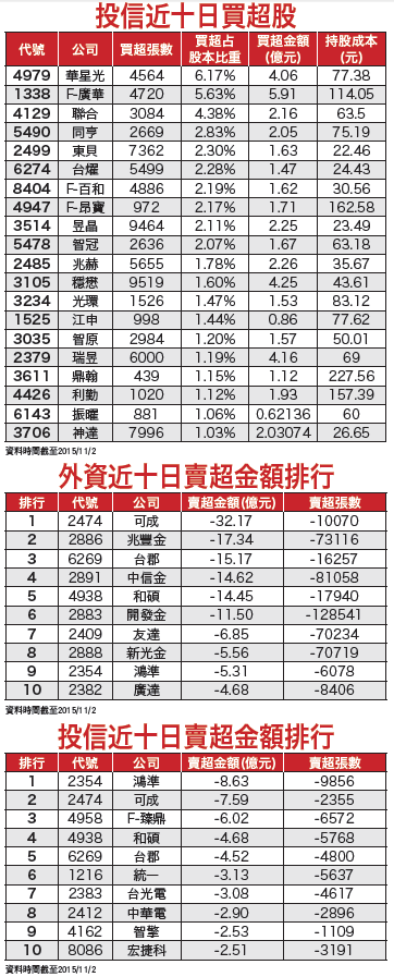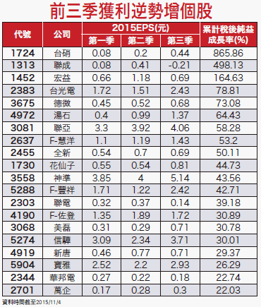 另在日本NTN集團中國落車在地化生產策略下,已有部份訂單由廣州廠移至襄陽廠生產,本月武漢本田訂單將開始出貨,有助稼動率再提升、改善獲利表現。但千萬不能輕忽「水能載舟,亦能覆舟」的威力,一旦資金風向球轉變,就要小心熱門股的多殺多行情。觀察近十日法人籌碼變化,外資及投信不約而同的集中調節iPhone 6s供應鏈,加上近期銷售不佳利空頻傳,恐不利未來股價表現,其中可成(2474)、和碩(4938)、台郡(6269)及鴻準(2354)均名列兩者賣超前十名,建議優先避開。此外,在外資賣超前十名中,金融股也占了四檔,與iPhone 6s供應鏈相當,籌碼鬆動情況也很明顯,應該與前述財報潛藏利空脫不了關係,若未來外資賣超金融股的檔數越來越多,就會成為台股上攻的阻力。營收、財報績優生 可望獲資金青睞目前時點剛好落在十月營收及第三季財報公布期間,可預期資金也會聚焦在數字優異的公司,投資人可密切留意陸續公佈的財報數字。例如已公布第三季EPS的公司,累計前三季稅後純益成長率年增超過兩成的有德微(3675)、全新(2455)、花仙子(1730)、F-豐祥、F-佐登(4190)、信驊(5274)、新唐(4919)、寶雅(5904)及華邦電(2344),均算是財報績優生,當中第三季EPS有旺季效應明顯、股價位階又偏低的德微及花仙子,未來股價應有補漲的空間。但要提醒的是,現階段已進入第四季,不適合再以今年的預估EPS來進行個股的評價,畢竟股價是在反應對未來的營運預期,建議改以未來四季的本益比來評估,會是比較合理的評價方法。