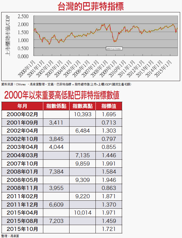 到底台股目前的位階是相對高水位還是低水位?個人持股部位要不要調整?看完本文弄清楚自己所處的位置,重新再出發,就能穩操勝券!近期真正綁住投資人的不是什麼黑天鵝,而是訊息面的紛擾,多空雜陳,全球總經數據與企業財報好壞參半。先是台灣九月外銷接單持續年減四.五%,為連續六個月落入負成長;接著歐洲央行召開利率會議,雖是維持○.○五%利率不變,但記者會中,ECB總裁德拉吉的談話暗示不排除以負利率的方式擴大QE,瞬間引發歐元暴跌。亞洲也沒閒著,中國人行宣布自十月二十四日起全面下調人民幣貸款和存款基準利率各一碼,直接加入負利率的行列(存款一.五%,CPI一.六%),以及下調存款準備率兩碼,大開資金水龍頭;十月二十八日美國FOMC會議,談話暗示不排除十二月升息,使公債市場動盪不安、十年期國庫券期貨大跌,黃金白銀繼先前大漲後馬上也大跌。到了周末(十月三十日),行政院主計處公布,一○四年第三季GDP與去年同期比較衰退了一.○一%,較八月預測數○.一%大減一.一一個百分點,大大不如預期,讓台股再挨一拳。更讓投資人困擾的是股票市場(包括陸股ETF)經常出現利多不反應,利空又麻痹,搞得投資人進退失據,猶如迷途羔羊。這時如果不重新仔細檢視所處環境條件及景氣循環的位階,投資人確實很難量身訂作,擬出最適合自己個性、條件的投資策略。投資人需要定位系統接下來我們會從總體經濟的角度切入,送給投資人一個GPS,清楚定位,知己知彼,擬出最適合自己的資產配置與交易策略,期能應付未來詭譎多變的投資環境,重新再出發。以一個經濟體的總量觀察,巴菲特指標能幫助投資人了解極限與底線的輪廓。股神巴菲特於二○○一年十二月時,在富士比雜誌的一篇專文中提到:用股市總市值和GNP的比值,可作為判斷整體股市是否過高或是過低,被泛稱為巴菲特指標,目前也常被專業法人作為研究市場估值的參考因素之一。由於台灣的GNP與GDP數據差異不大,所以用GDP數據取代,應用效果所差無幾。這個比值,若大幅降低,代表企業產生的經濟價值,嚴重被低估,買進股票相對有利,會有不錯的投資報酬。
