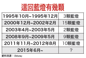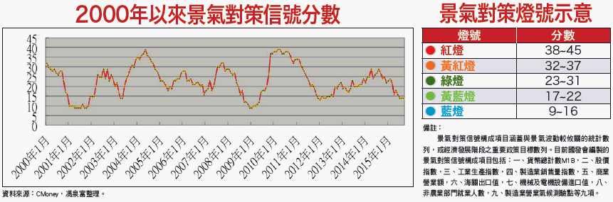 反之,如果比值接近歷史循環的高點,代表風險相對提高,但是此時的市場氣氛,往往也最樂觀,可以用巴菲特指標提醒自己控制風險。台灣一九九○年第一次萬點泡沫,衝到一二六八二時的巴菲特指標峰值為一.六七,第二次上萬點是在二○○○年二月(網路泡沫),衝到一○三九三時,峰值為一.六九五,金融海嘯前的高點出現在二○○七年十月,當時加權指數衝到九八五九,巴菲特指標峰值為一.九九一。市場愈成熟 參考性愈高讀者也許會覺得有疑問,金融海嘯前的高點沒破萬,為何巴菲特指標數值會高於先前的峰值,主要是二○○二年以後上市櫃公司大幅增加所致,即使指數不漲,上市櫃總市值仍會微幅墊高;所以不成熟的新興市場較不適用此指標,越成熟的市場參考性越高。以台股而言,二○○三年以後的數值參考度就相對高。也就是說二○○三年SARS襲台事件的低點○.八五五與金融海嘯的低點○.八六三,就可作為台股的底線參考;而一.九九一當然就暫時成為極限值參考。台股八月急跌到七二○三點,大約接近底線與極限值的中間,在沒有國際型的大災難出現前,遇到強大支撐也是理所當然。而目前巴菲特指標數值為一.七二一,相對距離歷史極限值較近,有必要提高風險意識。台灣資本市場大的架構如前所述,投資人了然於胸之後,接下來以中期循環的角度來觀察經濟基本面走勢;而景氣對策信號分數是一項相當具有參考價值的觀察指標。景氣對策綜合判斷分數是由行政院國家發展委員會根據各經濟活動指標所編製,用以判斷未來景氣,作為決策參考的一組信號標幟。標幟以紅,黃紅,綠,黃藍至藍燈分別代表景氣由繁榮至衰退的信號。最新公布的九月景氣對策綜合判斷分數維持上個月的十四分,表現不盡理想。這個分數已維持三個月不變,而分數所對應的燈號為藍燈,這是連續第四個月的藍燈,自從三月以來已經亮了兩顆黃藍燈、五顆藍燈。九項構成項目中,僅有金融面指標的貨幣總計數M1b恢復成綠燈(分數增加一分),逐漸好轉,其餘項目仍為黃藍燈或藍燈。景氣對策信號分數持續處於低檔藍燈區,在分數未見止跌回升前,景氣基本面仍屬薄弱。我們若仔細對照加權指數今年的走勢,大盤今年四月見高,五月開始走跌,事實上景氣對策信號分數早已領先於二月見高(廿四分),三月開始下滑,四月加速向下變成藍燈(十六分),下滑的加速度在近二十年裡僅二○○三年SARS事件出現過一次,但當時因為巴菲特指標數值約○.九,所以對大盤殺傷力不大。今年這一次領先加權指數兩個月,當時台股沉浸在搶攻萬點的樂觀氛圍,四月份外資還買超一○○二億元,投資人果然失去風險意識,所以重傷者大有人在。最慢明年三月脫離藍燈區