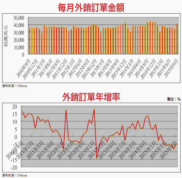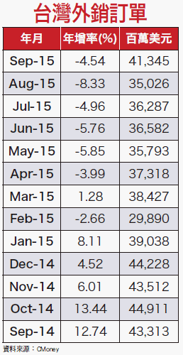 統計過去二十年來的景氣對策信號分數(一九九五年一月以來),位於十六分以下藍燈區的時間長度,最長的是全球網路泡沫後的調整階段,由二○○○年十二月~二○○二年二月共十五顆藍燈(自一九八四年改用現行燈號以來,最長的燈號紀錄);剔除一顆不算,最短的是二○○三年四月~五月僅兩顆藍燈(國內SARS風暴);而這次景氣於低檔調整時間會多長?以過去歷史一個完整循環約七十五個月~八十二個月來看,最慢明年三月脫離藍燈區(也有可能提前),進入復甦階段;所以現在屬於黎明前的黑暗。要預測景氣對策信號分數是否回升並提前脫離藍燈區,必須追蹤領先指標,其中最重要的就是外銷訂單。已公布的九月領先指標方面,不含趨勢指數為九七.○七,較八月下跌○.五二%,連續十四個月下跌。