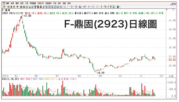 根據市調機構調查顯示,在全球三十一個熱門城市中,中國大陸的上海與北京的房價漲幅分別為一四%及一二%,居第七和第八位。大陸房價上漲,台灣也有受惠股嗎?F-鼎固(2923)主要在大陸地區從事不動產開發、銷售與管理及停車場業務等,是日月光集團創辦人張虔生、張洪本兄弟在大陸投資的房地產開發商。 截至第三季,F-鼎固持有的土地資產有高達二六五.八萬平方米的可開發建築面積,五六%位於上海,二三%位於重慶,以及江蘇、北京比重分別為一四%與七%,所在位置皆位於一線重點城市。F-鼎固手上的土地資產,大多是早在十年前取得的大陸一線城市精華區,目前土地庫存中仍有高達五○%的土地尚未開發(規劃中),隨著近年中國大陸持續發展,多年累積的土地資產增值利益龐大,雖然F-鼎固股本高達一七四億元,但持股逾一千張以上的大戶持股占所有股票的比重高達九九.一三%,顯見原始股東不輕易釋股。在獲利方面,今年累計前三季F-鼎固營收為一○一億元,比去年同期增加一三三%,EPS為一.二三元,第四季可望再認列資產重估增值收益,預期今年全年營收與獲利可達到近年新高,目前每股淨值高達三一.九六元。