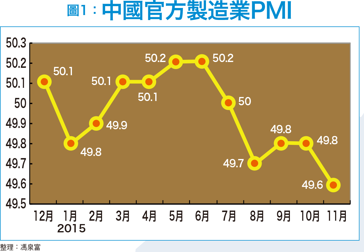 剛開始試點的資本帳戶開放,人行已經宣示「統籌規劃、循序漸進、先易後難、分步推進」的積極而審慎的態度,從直接投資(FDI和ODI)、跨境證券投資(QFII、QDII、RQFII)以及貿易與項目融資等三個方面穩健開展。只要大陸經濟穩健轉型,外匯市場的深度逐漸強化,類似日本、南韓與台灣的資本帳開放進程,將可高度期待,這是我們一直長線看多中國股市的最大原因。另一個中短期看好陸股的原因,是貨幣政策及財政政策會雙管齊下持續寬鬆,原因無他,就是為了「十三五計畫」之內GDP要比二○一○年翻倍。而十三五計畫實施在即卻適逢經濟放緩,只有一條路走,就是貨幣及財政政策的寬鬆。中國官方近期公布的十一月PMI數據顯示中國製造業活動仍舊處於萎縮區間(圖一),官方數據更創下三年多以來新低紀錄,反映中國整體經濟情況疲軟,全年GDP成長率保七難度有增無減。新公布的十一月製造業PMI為四九.六,連續四個月低於五十的分水嶺,顯示製造業活動處於萎縮,不但創下二○一二年八月以來新低,也不如華爾街日報預期的四九.九。官方製造業PMI分項指數中的新訂單與新出口訂單指數十一月雙雙下滑,新訂單指數再破五十,生產指數也從十月的五二.二下降到五一.九。同日公布的財新中國製造業PMI數據,也印證了中國製造業的低迷情況。十一月的財新中國PMI為四八.六,雖比起十月略有反彈,但已連續九個月處於萎縮區間。中國官方將全年的經濟成長目標設定為七%左右,但前三季GDP年增率只有六.九%,目前看來,今年GDP年增率不但保七不易,還可能創二十五年來最低。當然中國也不是沒有成長亮點,前三季服務業產值在總量占比已達到五一.四%,高於去年同期的四九.一%,且十一月官方服務業PMI也從十月的五三.一上升至五三.六,反映經濟由工業主導向服務業主導轉變的趨勢益發明顯。可預見二○一六年人大、政協兩會召開前,A股都仍可望持續受惠政策面利多。新經濟概念股如消費、資訊科技、醫療、環保、新能源等新興產業重要性可望躍進。例如中國大陸的休閒娛樂事業正蓬勃發展,電影業更是其中代表。電影市場潛力驚人 陸企布局淘金