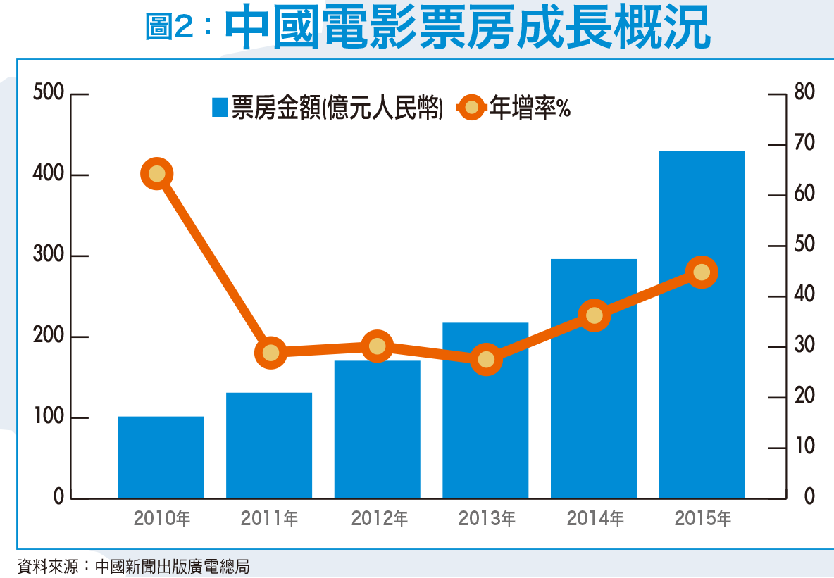中國國家新聞出版廣電總局電影資金辦公室表示,截至十二月三日止,大陸今年電影票房收入已突破四百億人民幣(圖二),再創新紀錄,成為僅次於美國的全球第二大電影市場。且四八.四%的年增長表現,也是近幾年以來十分傑出的一次。業內專家預測,未來五到十年間,大陸電影將邁向更有品質,發展更快的黃金期,到二○二○年大陸電影的年票房很有可能達到一千億元。統計顯示,今年大陸國產影片票房收入為人民幣二三七.二億元,占比達五九.二%,年增七三.一%;進口影片一六三.三億人民幣,占比僅三九.七五%,為近十餘年來最低。前十大賣座電影中,大陸國片就囊括六部。全大陸的電影銀幕總數達到三○八○九塊,城市影院達到六二一○家。也因為市場潛力大,成長速度快,電影業成為許多大陸企業趨之若鶩、布局淘金的熱門事業。譬如,大陸電商巨擘阿里巴巴轉投資的阿里影業近期宣布,將收購母公司阿里巴巴旗下的電影相關業務,預估收購金額五.二億美元。建議投資人可將影視板塊納入長線追蹤,伺機逢低布局,參與新經濟的高速成長。華誼兄弟(300027)、富春通信(300299)、新文化(300336)、萬達院線(002739)、光線傳媒(300251)、樂視網(300104,因樂視影業注入,停牌中)、電視劇龍頭華策影視(300133)等,都值得投資人長線追蹤。