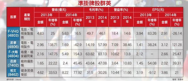 全球廣告市場方面,客戶群已囊括接近一○○%市占率,預估F-VHQ後市廣告業務營收年增率為五~一○%。由於全球廣告市場持續成長,預料在F-VHQ廣告後製技術長期獲客戶肯定,客戶黏著度高優勢加持下,未來可望每年穩定成長,也將為集團帶來穩定現金流。F-VHQ自二○一三年起新增電影業務,目前營收占比達三二.七%,今年前三季營收已達二.七二億元新台幣(二○一四年為一.八四億元),預估因製作技術深獲客戶肯定,電影後製市場接單量快速成長,後市營收年增率可達三○%。同時,因為F-VHQ已開始跨足中國電影產業上游發展,迅速累積技術能量,毛利率明顯提升。今年起,隨著中國電影市場業務量成長快速,穩定拉升集團營收獲利,前三季營收年增率高達三八%,稅後淨利大幅成長達一二三%。F-VHQ未來業務重心,將會來自中國電影市場,目前已經產出知名的「小時代」系列作品,未來也將加入科幻、魔幻等高特效影片,豐富電影產品線,以期於受惠人均所得大幅成長,政府支持政策持續出台,二○一四年票房已成長達四八億美元(僅次於北美市場),預估二○一六至二○二○年市場產值年平均成長率高達三○%,二○二○年預估票房規模將達一二○億美元,正式超越北美的中國電影市場中,大展身手、拔得頭籌!電視節目製作專業「頭牌」股─昇華成立於二○○○年的昇華(4806),主要營業項目為電視劇節目製作,包括:前製發想、劇本撰寫、演員安排、戲劇拍攝及後製、藝人經紀等領域,同時也位居中游的後製、發行要角地位。昇華於戲劇製作領域累積豐富經驗,自編劇到拍攝製作、聲光特效後製等流程,為國內少數幾家擁有整合性製作能力的娛樂傳播公司。昇華成立十五年以來,已成功打造出十部以上大型電視劇,於偶像劇、都市情感劇、古裝劇、鄉土劇等不同戲劇類型市場,皆成功製作出代表性作品(據查,台灣有線電視台二○一三年收視率排行榜第一名,皆為昇華作品)。根據市場統計資料指出,中國大陸二○一三年電視節目進口總額為五.八七億元人民幣,電視劇占比高達四一.七六%;全年電視節目進口量一八九四三小時,其中,電視劇總計達二一三部,共計六五四七集。昇華二○一四年電視節目銷售對象,主要集中兩家中國大陸戲劇節目發行公司(二○一四~二○一五年前二季,外銷營收占比皆逾九一%),目前於中國進口電視劇市占率五.二五%。未來將持續深耕中國市場,擴展多元銷售通路;同時,也將繼續引進新節目,以有效分散節目類別過度集中的風險。未來營運目標鎖定於產值規模成長快速,預估可於二○二○年擴大至一七.五七億元人民幣的中國電視劇市場,搶下一席重要地位。婚禮顧問業首家掛牌股─F-大略根據中國結婚產業市場發展調查結果指出,過去五年以來,中國每年平均多達八一一萬對新人結婚。以經濟發展最快速的上海來看,根據上海民政局資料指出,上海目前常住人口約二千四百萬戶,每年結婚人數約十五萬對,婚禮費用總計約人民幣二十萬元,因此,上海地區全年結婚消費市場總產值高達約三百億元人民幣,規模相當驚人。