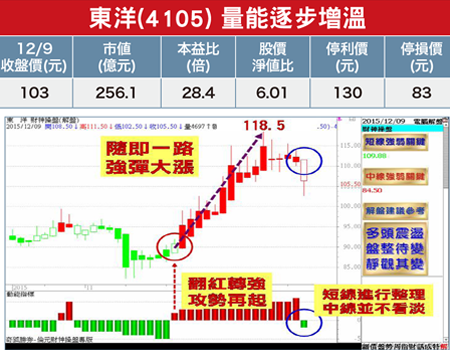 東洋(4105)為全球第三家擁有微脂體製造技術的生技藥廠。主要利基題材有:(1)受惠於為J&J(嬌生)代工製造治療乳癌與卵巢的抗癌針劑持續放量出貨,及旗下抗生素Liop-AB、利基抗癌藥TS-1、Leuprolide等特色藥陸續邁入銷售高峰帶動,十月營收再度衝上三億元之上,累計前十月營收二五.七六億元。第四季傳統旺季,加上美系大廠客戶的抗癌針劑交貨仍有高峰可期,營收可望逐月攀高。(2)轉投資持有智擎(4162)股權達一九.三二%,智擎胰臟癌新藥陸續取得美國FDA和台灣TFDA藥證,且預計年底或明年首季亦可望獲得歐洲藥證及亞洲藥證,將帶來可觀的轉投資收益,法人估今年約可認列五千一百萬元轉投資收益,折合每股貢獻約○.二一元,明後年估分別可貢獻四.二和四.四億元,折合每股貢獻約一.六九及一.七六元。前三季EPS二.一一元,預估全年獲利仍可較去年成長。(3)近期取得癌症新藥Plitidepsin台灣獨家代理權,已完成臨床三期研究復發或難治性多發性骨髓瘤收案試驗,預計二○一七年取得歐洲或美國許可藥證,二○一八年在台上市。(4)政策加持、IPO和大戶條款解套,中國十三五計畫全面二胎化,將大力扶植健康醫療產業,民進黨總統參選人蔡英文率先端出政策牛肉,預計成立亞太生技中心,將醫療器材、新藥和疫苗研發列為重點發展領域,也為相關生技族群注入一劑強心針。