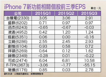 市場開始關注iPhone 7搭載無線充電、Type-C接頭、OLED面板、藍寶石玻璃螢幕、防水機殼、相機六片式鏡頭,以及中央處理器採用台積電InFO技術等新功能,相關供應鏈動能備受矚目。蘋果(AAPL)於十月初發表了iPhone 6S系列手機,引起市場話題,開賣首周銷售量創下佳績,不過至今歷經兩個月,市場對6S的銷售越來越不樂觀,開始聚焦在iPhone 7,相關供應鏈話題也漸漸炒熱。傳言iPhone 7將提前上市而iPhone 6s銷售疲軟,首當其衝的就是台灣的相關供應鏈,有消息傳出,由於市場對iPhone 6S的銷售不樂觀,導致蘋果將16G版和64G版都降價求售,位在上海的和碩(4938)子公司昌碩科技目前也停止招工。有陸媒報導稱,由於6S的銷售不如預期,昌碩科技部分相關生產線遭到裁撤,有數百名員工轉去和碩位於崑山的另一個生產基地,但和碩第一時間對此提出反駁,表示每年的新產品生產良率提升之後,都會進行產能調整,況且今年員工流動率僅個位數百分比,遠遠低於往年,本就不需要大舉招工。比起6S的銷售狀況,現在各界更加在意iPhone7的新功能與新配備,綜觀目前消息,市場傳言iPhone 7可能採用無線充電,並搭載Type-C,面板採用OLED面板,也有的稱將移除HOME鍵,採用藍寶石螢幕,中央處理器則是採用台積電(2330)的InFO技術,相機更將採六片式鏡頭,至於上市時間,可能比往年九月更早一些。除了推出時間提早之外,也有市場消息指稱,iPhone 7可能捨棄耳機孔,僅保留蘋果專屬連接器Lightning作為唯一的外接埠,藉此讓機身更薄,為支援無線充電做準備。InFO助攻 傳台積電吃A10大單在處理器部分,有美系外資預測,台積電在InFO封裝技術的助攻之下,有望獲蘋果iPhoen 7 A10採用,不排除全拿A10訂單,加上這次A9處理器台積電版與三星(Samsung)版的事件,外界預估,台積電將取得較A9逾五○%更多的訂單占比。