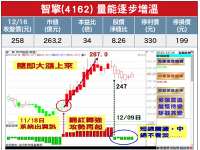 智擎(4162)主要利基題材有:(1)營運表現耀眼,六月再獲授權夥伴Merrimack藥廠一千一百萬美元里程金和再授權金,加計之前已入帳的五百萬美元,帶動前三季EPS衝上四.一八元歷史新高,並創下毛利率九八.九%的上市櫃公司空前紀錄。(2)Merrimack於二○一四年九月將MM-398歐洲及亞洲銷售權授權予Baxter(百特),Baxter今年五月向EMA提出藥證申請,年底前送件亞洲各國提出藥證申請,預計快者年底前、慢者明年初,可望順利取得歐、亞藥證。根據協議,雙方授權金二.二億美元,其中九千萬美元將在拿到藥證前認列,扣除先前已認列的二千六百萬美元,剩下的六千四百萬美元將在取得藥證前全數入帳,折合每股潛在貢獻約二十元(以新台幣匯率三十二元及現有股本一○.二億元計)。(3)胰臟癌新藥ONIVYDE(安能得)陸續獲美國FDA及台灣TFDA藥證,並正式在美國開賣,上市後三年內若銷售達標,陸續將有一.三億美元銷售里程授權金入帳,折合每股潛在貢獻約四○.八元,法人保守預估智擎今、明兩年EPS有上看二十元以上實力,不過仍需視審查進度及銷售狀況而定。(4)除了安能得外,智擎開發的第二個研發專案放射輔助治療PEP503,法國夥伴主導軟組織肉瘤樞紐試驗,智擎負責的亞太區臨床部分也已申請進行試驗,同時在台灣進行直腸癌第一/二期臨床試驗,市調機構預估PEP503潛在授權價值將不亞於MM-398。