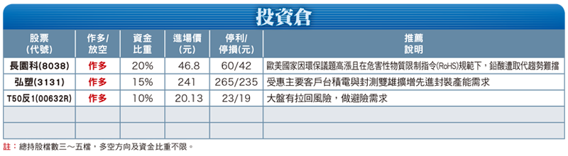 最近台股對美國升息已提前反應,只要升息腳步如預期緩升,有機會以利空出盡解讀,回歸個股及產業基本面表現,年底仍有集團及投信作帳行情可期。對於紫光擬收購力成、矽品、南茂三家半導體封裝測試公司股權案,經濟部等相關單位應予嚴審,陸資投資台灣半導體產業的議題由行政審查擴大至立法層面,其後續影響仍待觀察。電子業是台灣的經濟命脈,找尋全球發展的出路才是重點,有技術有人才才有未來,併購只是一時,雞蛋全部放在同一籃子,風險非常大。長園科(8038):主要為電池模組。長園科十二月參加在美國舉行的國際改裝車展,這是長園科技首次參加國際車展,也是高效氧化鋰鐵磷啟動電池首次在國際車主面前亮相。其實隨著歐美國家因環保議題高漲且在危害性物質限制指令(RoHS)規範下,鉛酸遭取代之趨勢也將不可擋,由中國近期對其境內鉛酸公司提出環境保護要求及集中管制也可見;同時Tesla熱賣也帶動國際電動車市場這二年快速崛起,故長園科對市場需求與成長樂觀看待。弘塑(3131):濕製程設備廠。受惠主要客戶台積電(2330)與封測雙雄日月光(2311)、矽品(2325)擴增先進封裝產能需求,今年接單創歷史次高;弘塑第三季營收五.一五億元,季增一八.九三%、年增二九.五七%,以弘塑往年十二月營收達全年最高推估,第四季營收將為今年單季新高點。