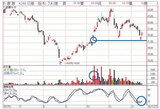 十二月的全球股市恐慌指數再度暴衝,歐元區擴大QE規模不如預期,引發第一波賣壓,接著國際油價又跌破七年新低三四.五三美元,突顯全球經濟動能不足,需求不強。更令市場關心的是十五、十六日美國聯準會FOMC會議後的升息動作對全球帶來的影響,讓市場觀望氣氛更加重。台股加權指數十一月由八八七一點開始回檔,十二月十四日(周一)回測七九八○點,共跌八九一點,這段期間台股仍能保持人氣的產業還是生技股。十四日民進黨總統候選人蔡英文以「生物經濟產業國際競合契機與挑戰」發表專題演說,論述生技兆元大夢,並規劃以中研院為軸心,包括國家生技研究園區、南港生技園區、內湖科技園區與新北產業園區,連結竹北醫材園區打造四大生技聚落。生技股已成為下一世代國家核心產業。生技股十二月股價普遍跌幅也很大,上檔套牢不輕,加上大多數獲利狀況都不理想,選股要小心。F-康聯(4144)以銷售肝膽類用藥、呼吸道類用藥、心血管類用藥為主,連續四年EPS都保持五元成績,是國內生技醫藥股少數獲利穩健的模範。以財報來看,前十一月營收年增二五%,毛利率五三.五八%,負債比二二.二%,每股淨值四十三元,前三季EPS三.三六元,全年估四元以上,以十五日收盤五十六元計算,本益比僅十四倍,支撐五十四至五十二元區間。