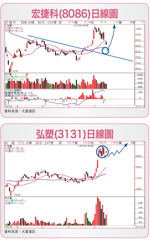 台積電(2330)宣布到中國南京獨資設晶圓廠,是配合政府政策較晚到中國投資的模範企業,但為企業生存與發展全球性必要,到中國投資是必然趨勢,市場普遍預期A10晶片將成為下一代iPhone的處理器,台積電將可能再度全包蘋果(AAPL)處理器製造訂單。目前A9處理器生產有六○%至七○%是委由三星(Samsung)處理,三○%至四○%是委由台積電製造。蘋果是台積電利用整合扇出型封裝(InFo),進行處理器量產的第一個客戶。InFo訂單將為台積電二○一六年帶來逾三億美元的營收,並於二○一七年達十億美元。據估計,A10處理器的生產可望為台積電帶來二十二億至二十五億美元的營收,各種報告已顯示台積電可能為A10處理器獨家生產商,因此供應鏈像精材(3374)、辛耘(3583)、漢微科(3658)、弘塑(3131),可趁這一波大盤回測逢低布局。新藥股回測月線守穩 逢低布局此外,台灣投資人較能接受新的事物或技術,生技剛好符合這種思維,目前台灣生技產業與一九九四年的電子業發展相比,本益比約是四十至五十倍,加上目前市場對生技族群也情有獨鍾,包括總統參選人的加持,成為當紅炸子雞,最近在政府持續釋出利多政策,許多海外學有專精好手陸續歸國,公司也搶著回台掛牌,所以生醫櫃買指數是唯一能站穩月線的類股。而大盤修正,新藥指標浩鼎(4174)、中裕(4147)、智擎(4162)、太醫(4126)等短期漲多壓回,建議回測月線守穩可逢低布局。PA的宏捷科(8086)十一月十三日起至十二月十日法人連續買超二十個交易日,共大買二七二五九張,而股價壓回二十日均線,投資朋友可注意是否為法人季底作帳領先股。