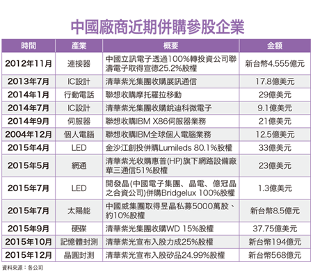 台灣封測廠在一瞬間突然成為全球半導體產業的寵兒,除了紫光宣布要認購矽品(2325)的私募案外,備感威脅的日月光(2311)也不甘示弱,喊出將一○○%收購矽品,這場台灣封測廠大哥及二哥的戰場,再加上被外界稱之為「中國巨鱷」的中國紫光集團,究竟台灣封測產業會變成日月光獨霸?還是矽品結合紫光力抗日月光?抑或是紫光一統江湖?中國紫光集團又出手了!而且這次一口氣就是砸下新台幣六八七.七億元,分別以五六八億及一一九.七億元,認購矽品及南茂(8150)私募,預計將可取得矽品二四.九九%及南茂二五%股權。但紫光集團是否會就此結束其半導體併購大計?業界人士直言,很難!紫光接下來應該還會再吃下與矽品、聯發科(2454)有產業關係的台灣封測廠,以併吞非日月光體系的台灣封測廠。台灣股市本益比偏低中國之前發展半導體產業,結果卻是雷聲大雨點小,即使有了張汝京助陣,但是中芯國際卻完全無法撼動台積電(2330)的地位,甚至連聯電(2303)都還比中芯國際強大,這樣的成績代表著,中國自行發展半導體的策略,除了走錯方向,基本上,整個方向都是錯誤的。但是現在的中國不同了,銀彈成為他們最好的武器,再加上台灣股市本益比偏低,很多個股本益比都僅在十倍上下,對於資本市場來說,資金是公司發展的重要命脈,無法在資本市場籌措到資金,光靠本身營運,對企業經營者來說,只能守成,要去擴大版圖的難度極高。法人表示,台灣封測廠的股價其實已經沉寂很久了,一般投資人給封測廠的股價本益比也頂多就是十倍到十三倍,或是更低,不僅日月光僅有十倍左右,矽品也大約僅在十三倍左右。這次紫光一口氣將認購矽品私募股的價格拉高到五十五元,換算本益比大約為十五倍,雖然還是偏低,但至少對封測廠來說,已經是近期少見的水準了。對於矽品接連尋求鴻海(2317)及紫光的股權合作,企圖稀釋日月光的持股比重,日月光終於忍不住,決定全面收購矽品股權。不過市場預期,這對矽品來說反而是一舉兩得。由於矽品對日月光之前公開收購的股權,正在進行收購無效之訴,而日月光大動作宣布全面收購,恰好說明了當初承諾財務性投資的目的並不存在,有利於矽品訴訟;或是最後矽品官司敗訴,法院認定日月光收購有效,不排除紫光可能加碼提高對矽品私募的認購價,進而增加日月光後續收購的難度。隨著電子產業越來越成熟,企業要成長,光靠自身的有機成長已經有限,台達電(2308)董事長海英俊也直言,現在企業要成長,併購已經是一個很重要的策略。更何況對中國來說,現在要發展自己的產業,光是時間就已經輸人家一大截了,就算砸大錢,也沒有辦法立刻見到成效,因此最好的方式,就是併購。像之前紫光集團捧了二三○億美元(約新台幣七五九○億元),去跟美國DRAM廠美光(Micron)求親,就是一個最好的案例,如果順利完成併購,中國的半導體產業就直接成形,而且包括技術與產能,都可以一次到手,只不過最後因為美國政府反對而告吹。中國發展半導體戰略 砸錢併購但是這已經確立了中國發展半導體的戰略,就是砸錢併購。不過,半導體是台灣之所以能夠在全球電子業占有一席之地的關鍵,台灣社會對於中資想要入股台灣半導體廠,不管是從政治或是經濟角度,都會是嚴陣以待。然而儘管官方試圖用法令卡關,產業人士直言,效果其實有限。法人分析,在電子產業中,中國的強項還是在於中下游產業,像是筆電、智慧型手機等,但這些都是終端產品,如果單純做品牌,而沒有掌握上游關鍵零組件,一旦零組件遭到斷鏈,品牌廠也出不了貨。另一方面,電子已經變成微利產業,要如何擴大獲利,除了增加出貨量外,透過產業整併、加速垂直整合,從上下游的整合之間,自然會有更多的獲利。上次紫光集團高調放話,希望促成旗下子公司展訊與台灣IC設計龍頭聯發科合併,就引起台灣政界及產業界軒然大波,儘管聯發科董事長蔡明介對此事表達樂觀、開放的態度,但是在官方政策依然不放手的狀態下,聯發科與展訊的消息也逐漸在媒體版面上消失。紫光集團則是改弦易轍,既然不能跨入IC設計,就從IC封裝測試下手,而且不改其要就買大廠的策略,第一步就買了台灣記憶體封測龍頭力成(6239),每股七十五元認購力成私募股,共計斥資一九四億元,取得二五%股權,並將取得一席董事。紫光搶親台灣封測廠 老謀深算法人分析,紫光集團的動作還沒有結束,雖然日月光、矽品、力成及南茂,號稱是台灣四大封測廠,不過台灣封測廠中,還有不少仍是在產業界相對有規模的公司,包括超豐(2441)、京元電(2449)、欣銓(3264)、頎邦(6147)、矽格(6257)等,有些是跟矽品具有策略聯盟關係,有些則是聯發科的合作夥伴,預料紫光的銀彈還是會繼續朝向這些公司擲出,讓紫光集團的半導體,尤其是在封測這塊,將穩居全球至少第二名的地位。產業人士指出,紫光集團一口氣接連入股矽品、力成及南茂,而不是先入股超豐、京元電、欣銓、頎邦、矽格等二線封測廠,基本上的戰略,就是要測試台灣政府的態度。如果紫光集團先入股了二線封測廠,最後卻在入股一線廠遭到卡關,則入股二線廠的意義及實際作用一點都不大;反之,先把矽品、力成及南茂這三家大廠丟出來,如果過關了,紫光集團接下來要吃二線廠的難度也就不高了,屆時紫光所設想的封測版圖也就此成形。法人指出,京元電是聯發科IC封測的重要下游廠,雖然營運規模跟日月光與矽品相比