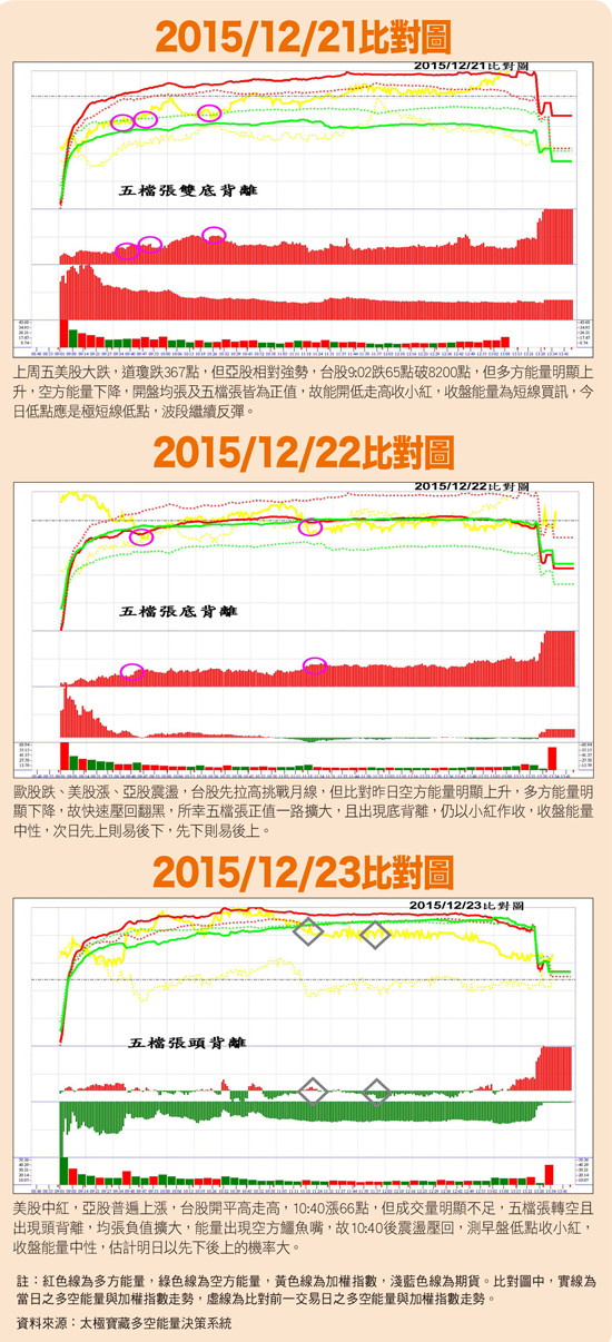 上周本欄已清楚說明,七九八○點就是波段回檔低點,配合日、周多重時間轉折,將展開波段反彈。技術面有上攻八五三五點的機會,甚至不排除上攻八六○○至八七○○點,極短線向上遇壓若有拉回,要把握買點。上周四(十二月十七日)凌晨美國聯準會如預期升息一碼,但表示寬鬆政策不變,激勵全球股市大漲!台股早盤就拉高百點,由於空方能量大幅上升,指數開始橫向震盪,所幸多方能量更強,五檔張還出現底背離,故能維持高檔整理,最後一盤拉升三十四點收最高。雖然量價齊揚,但收盤能量並無買訊,又已經連漲三天,且收盤八三一九點已遇月線及頸線反壓,極短線回檔機率大。上周五(十二月十八日)由於美股收盤大跌,台股開一低破低盤,果如能量警示出現回檔,收跌六十二點。然而收盤能量並無賣訊,表示極短線回檔雖然還沒結束,但向下的時間空間應該相當有限。晚間美股繼續大跌,跌幅加重,道瓊指數重挫三六七點!但本周一(十二月二十一日)亞股相對強勢,台股九點零二分跌六十五點破八二○○點,而多方能量明顯上升,空方能量下降,開盤均張及五檔張皆為正值,故開低走高收小紅。收盤能量為短線買訊,當天低點應是極短線低點,繼續波段反彈之路。周二(十二月二十二日)歐股跌、美股漲、亞股震盪,台股先拉高挑戰月線,但比對前一天空方能量明顯上升,多方能量明顯下降,故快速壓回翻黑,所幸五檔張正值一路擴大,且出現底背離,仍以小紅作收。收盤能量中性,次日先上則易後下,先下則易後上。周三(十二月二十三日)美股中紅,亞股普遍上漲,台股開平高走高,十點四十分漲六十六點,創本波反彈新高。但成交量明顯不足,五檔張轉空且出現頭背離,均張負值擴大,能量出現空方鱷魚嘴,故十點四十分後震盪壓回,測早盤低點收小紅。當天為七九八○點反彈第八天時間轉折,本有見高回檔的危險,但櫃買指數是在周二見高點,周三十點之後就一路向下,以最低點中黑作收,反而沒有時間轉折的問題。由於收盤能量中性,估計周四(十二月二十四日)加權指數若能先壓回測周二低點,櫃買指數則測十日均線,而能量偏多,則反倒有先下後上的機會。