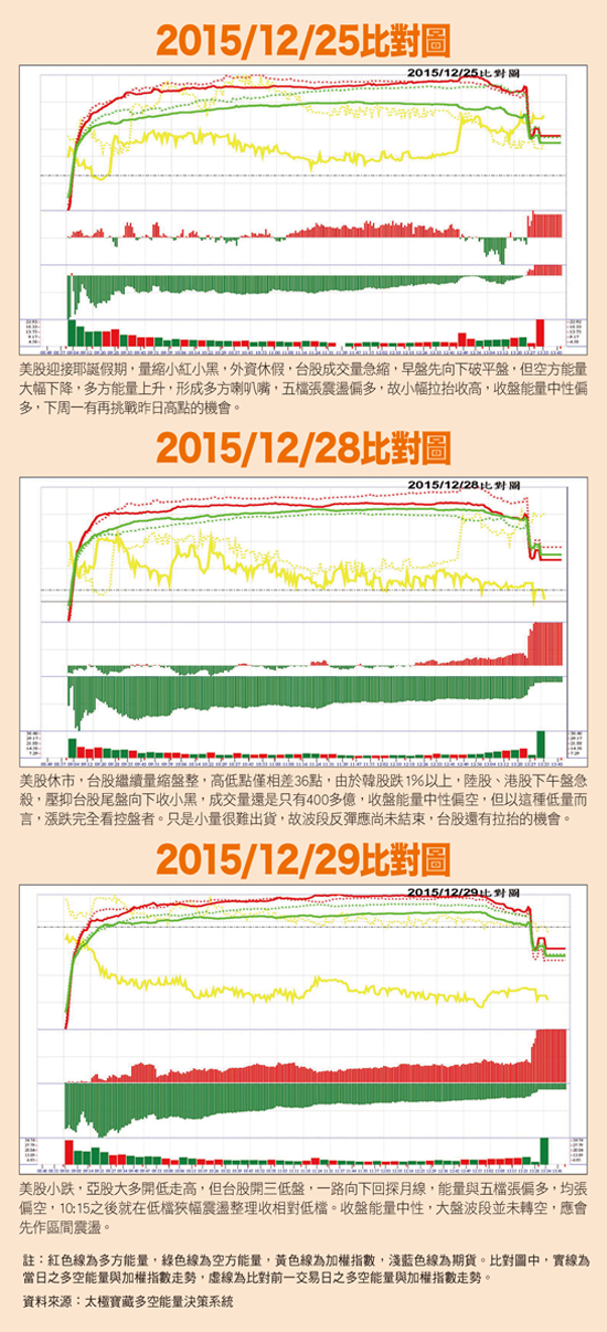 上周本欄已清楚說明,原本上周三(十二月二十三日)為七九八○點反彈第八天的時間轉折,但櫃買指數已提前拉回,反而不必擔心轉折向下的問題,頂多是先做震盪整理,還會再上。而個股的表現會較大盤活潑許多,選股與操作節奏才是重點。上周四(十二月二十四日)清晨歐美股市大漲作收,道瓊漲一八五點,亞股卻大多開高走低。台股先拉高七十七點,但空方能量向上穿越多方形成空方鱷魚嘴,五檔張偏空且出現頭背離,均張也偏空,故一路壓回收最低僅小漲八點。然而,收盤能量中性,表示行情並非向下,只是整理。而整理盤的特色就是先上易後下、先下易後上。上周五(十二月二十五日)美股迎接耶誕假期,量縮小紅小黑。外資休假,台股成交量急縮,早盤先向下破平盤,但空方能量大幅下降,多方能量上升,形成多方喇叭嘴,五檔張震盪偏多,故小幅拉抬收高,收盤能量中性偏多,極短線有再挑戰周四高點的機會。美股休市,本周一(十二月二十八日)台股繼續量縮盤整,高低點僅相差三十六點,高點小幅突破上周四高點;但由於韓股跌一%以上,陸股、港股下午盤急殺,壓抑台股尾盤向下收小黑。成交量還是只有四百多億,收盤能量中性偏空,極短線要先作回檔。美股小跌,十二月二十九日亞股大多開低走高,但台股開三低盤,一路向下回探月線,能量與五檔張偏多,均張偏空,十點十五分之後就在低檔狹幅震盪整理收相對低檔。收盤能量中性,應會先作區間震盪。但以這種低量而言,漲跌完全看控盤者,要待出量時才有較明確的方向。只是小量很難出貨,故波段應尚未轉空,台股回檔之後,還有再反彈的機會。由於短線加權指數空間不大,以中小型股表現為主。故選股與操作節奏才是獲利關鍵。選股方向:(1)產業題材具未來性(ADAS先進駕駛輔助系統、物聯網、機器人、Type-C、節能環保、中國開放二孩政策……),個股基本面趨勢向上,最好本益比仍低。(2)大股東偏多,特定人(包括法人、大戶)持續買進。(3)技術面為多方趨勢,或中期回檔整理後轉強向上。