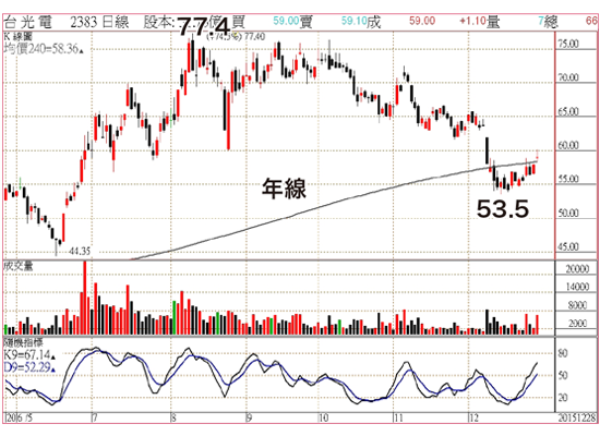 環保意識抬頭,全球智慧型手機品牌全面導入無鹵素基板,台光電(2383)經過三年的轉型調整,目前是全球第一大無鹵素基板廠,同時打入iPhone 6S成為蘋果供應商。調整為環保材料,利潤反而大幅提升,毛利率由二○一四年首季一五.八%,去(二○一五)年第三季已提升至二五.七六%,稅後純益率更由五.九四%調升至一二.八三%,營收連續兩年平均一二%成長,前十一個月營收一九二億元,全年估二一○億元,以股本三一.七三億元計算,營收周轉率高達六六一%,可見產品市占率及市場需求都很高。台光電去年營收七、八、九連三個月創新高,十、十一月分別衰退一三%及一四%,是受iPhone 6S出貨高峰期已過影響。連續兩年獲利三級跳,二○一四年EPS四.九一元,年增八二%,二○一五年前三季EPS五.六六元,全年估七.八元,再創歷史新高,以十二月二十五日收盤價五七.九元計算,本益比僅七.四倍,太低了,具長線投資價值。加權指數由八月二十四日七二○三止跌回升,至十一月五日達八八七一,共漲一六六八點,台光電股價卻由八月七七.四元跌到十二月五三.五元,跌幅高達三一%,去年台灣GDP連一%都保不住,景氣十分低迷,反而台光電營運創歷史新高,是難得高獲利、高成長公司,股價卻逆勢下跌五個月,尤其本益比這麼低,目前年線於五六.九元,連續二周考驗年線買氣,如果守住有機會以年線為底部,重啟一波多頭。