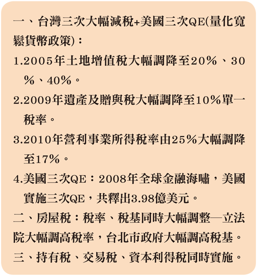 問:美國聯準會Fed升息,國內中央銀行向來是隨之起舞,但這回反而降息,這意味著什麼?房地合一稅自1月1日上路實施後,台灣房市的未來發展為何?答:Fed升不升息,牽動著台灣股市及房市的敏感神經,在美國經濟逐漸復甦之後,原本大家都認為應該早在去(2015)年9月就會有升息動作,但Fed直至12月下旬才升息,在此之前,各界幾乎都預期央行會跟進升息,沒想到,卻讓大家跌破眼鏡,反而逆勢調降半碼,總計2015年共調降一碼。 就整體大環境來說,央行這次降息動作與Fed脫鉤,是否間接透露出台灣經濟情勢堪憂的困境?去年GDP保一不成,而今年面對依賴度極高的中國大陸經濟成長趨緩的情況下,台灣的經濟前景將更險峻,因此,央行此際逆勢降息,應與整體經濟發展息息相關。 至於房地合一稅上路對房市的影響,之前已討論過很多次,包括非自用住宅,出售獲利按持有年限課15~45%的稅率,而自用住宅持有滿6年、獲利400萬以上課10%,實際影響不大;衝擊最大的是短期進出的投資者,以及過去只要繳交利得20%的外國人或外國法人,今後則是課大幅提高的35~45%稅率。 另因奢侈稅於1月1日落日,則一些過去被奢侈稅鎖住的投資客(或屋主)開始拿出來拋售,建商手中預售屋餘屋,以及過去惜售屋主鬆動而釋出的物件,恐讓市場上的「委售量」暴增,而導致今年房價再下修一成以上。 房地合一稅衝擊大,但目前另有一派樂觀認為,「證所稅」都能廢掉的情況下,也許哪一天「房地合一稅」也能廢除。但看證所稅從通過到暫緩實施,再到廢除,歷經3年的時間,另「奢侈稅」從2011年6月實施,至房地合一稅於今年上路,奢侈稅取消也歷時四年半來看,一般購屋民眾最好不要抱太大的期待,更何況加重持有稅乃世界潮流,非台灣特有。 此外,今年1月1日新的公告地價,以六都都普遍往上調高3成的情況下,今年11月要繳納的地價稅則會多出3成,一般民眾也都要有荷包縮水的心理準備。 而影響最大的仍是豪宅族及建商,高力國際總經理劉學龍指出,有某上市建商估計,依據台北市豪宅稅、房屋稅等高級住宅稅,推估建商餘屋及富人投資置產目前空置中的豪宅,總金額高達3500億元,更值得關注的是,這些房子,並非建商、富人刻意囤房,而是脫手不易。 值得重視的是,這一波房價飆漲過程,曾出現三大巧合及錯誤的助漲助跌情況,巧合的是2008年全球金融海嘯 ,美國三次QE共釋出3.98億美元,在此前後台灣分別實施三次大減稅,進一步導致市場長期處於超低利率與資金氾濫狀態,影響所及,房價一再飆漲。 在此情況下,政府為壓抑過分飆漲的房價,遂自2014年起連續大幅調高房屋稅稅基與稅率,並且房地合一稅又自今年1月1日實施,亦即在短短一年半之內持有稅(房屋稅、地價稅)、交易稅(契稅)與房地合一交易利得稅同時實施;導致台北市高級住宅與豪宅市場同時出現交易重挫情況,並且逐漸由台北市、新北市蔓延至桃園、中南部與全國各地。