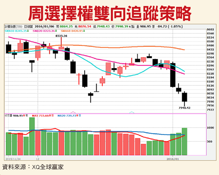 二○一六年的第一個交易日,由於陸股暴跌,造成全球股市在開市表現相當的慘淡,也凸顯出大陸的股市和經濟狀況對全球的影響力,一月四日上証指數下跌了將近七%,因此也觸發了熔斷機制,一月五日大陸官方出手護盤,證監會也趕緊表示會約束大股東的減持行為,消息指出「國家隊」也將進場買進權值股,陸股因此暫時止跌回穩,但是後續盤勢是否會反轉向上,還是有待觀察。台股周一受到全球股災的影響,大跌二二三.八點,周二和周三又連續兩天向下修正,周三指數收在七九九○.三九點,未能站上八千點的整數關卡,從技術面來看,月線和季線持續下彎,指標DMI顯示,目前是由空方控盤,力道不斷的在加強,接下來的觀察重點,將放在指數是否能重新站回八千點之上,如果未能重新站穩,後續恐怕會繼續向下修正。總觀今年全球經濟情勢與台灣本身的經濟走勢預期,仍然保守。加上台股指數目前均線空頭排列,未來行情要樂觀不易。但目前三大法人合計期貨淨多單,外資期貨仍為淨多單,目前期貨未平倉淨多單兩萬零一百八十口,前十大交易人多空比大於一,觀察自營商選擇權部位,買進買權及賣出賣權,從外資期貨部位和自營商選擇權部位來看,外資和自營商對台股後市同步偏多看待,可待指數出現止跌訊號後,布局賣權多頭價差(溫漲做莊)策略,賺取時間價值的流失,同時能降低看錯方向的風險。