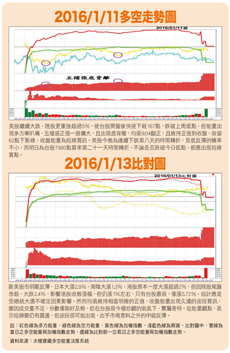 上周本欄已清楚說明,台股加權指數有下探七七六二至七八五六點的機會,但在國內外利空連續襲擊之下,能量並未出現波段賣訊,七八○○點以下有機會出現波段買點。上周四(一月七日)美股大跌,道瓊跌二五二點,亞股原本開盤相對抗跌,但陸股開盤後立即重挫,兩度啟動熔斷機制,下跌超過七%,共僅交易十三分鐘就收盤,影響亞股全面下殺!台股一度重挫二二○點來到七七七○點,所幸能量與五檔張偏多,均張負值下半場縮減到零軸,故拉八十二點下影線。周四晚間美股繼續大跌,道瓊重挫三九二點,但陸股取消熔斷機制,並限制大股東賣股,激勵上周五(一月八日)亞股相對強勢。台股開盤後先下殺六十三點未破前一天低點,多方能量快速拉升,空方能量下降,五檔張偏多且出現底背離,均張九點零五分翻正並維持到收盤,故台股從低點一路拉抬翻紅,收次高點。收盤能量為短線買訊,表示短線不論是否再破低點,應該下檔空間都相當有限,且很可能一破低點就向上反彈。上周五美股繼續大跌,本周一(一月十一日)陸股更重挫超過五%,台股開盤後快速下殺一六七點,跌破上周低點,但能量出現多方喇叭嘴,五檔張正值一路擴大且出現底背離,均張九點零四分翻正,且維持正值到收盤,故留六十二點下影線,收盤能量為短線買訊。美股周一晚間為連續下跌第八天的時間轉折,見低反彈的機率不小,而周二為台股七九八○點算來第二十一天時間轉折,不論是否跌破周一低點,都應出現短線買點。周一晚間美股果然見低拉尾盤翻紅小漲,周二(一月十二日)台股早盤先反彈六十三點,未能越過周一高點;均張十點十五分之後由正翻負後,就維持負值,故大盤又一路向下探周一低點,也沒破低點,尾盤護權值股拉抬收小黑。但中小型股殺聲隆隆,上櫃指數重挫三%左右,市場氣氛相當恐慌!然而能量依然沒有賣訊,不排除是最後恐慌趕底。搭配時間波浪為第二十一天的時間轉折,台股有機會出現反彈。周三(一月十三日)由於歐美股市明顯反彈,日本大漲二.九%,南韓大漲一.三%,港股原本一度大漲超過二%,但因陸股尾盤急殺,大跌二.四%,影響港股收斂漲幅,但仍漲一%左右,只有台股最弱,僅漲○.七二%,估計應是受總統大選不確定因素影響。