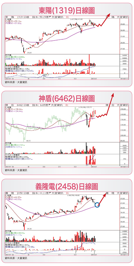 元月一日廢除證所稅之後,雖然開春加權指數跌破八千點,不過十年線位置七八八二點如果有守下,將有助於中實戶歸隊,而勞工全面實施周休二日,也有助相關行情營運看俏。至於中國正式啟動的二孩政策,驅動人口紅利受惠題材,對於相關嬰幼兒、奶粉、產檢、月子中心等為利多,可注意麗嬰房(2911)、F-淘帝(2929)、佳格(1227)等。剛落幕的CES展,今年重點在汽車電子安全控制及自動操控、自動駕駛,同致(3552)、東陽(1319)、康舒(6282)、為升(2231)、聯亞(3081)等,也是值得注意的重點產業股。布蘭特原油價格去年十二月最低來到三四.八美元,創下二○○四年以來新低紀錄,低油價影響塑化上游原料價格下修,下游化工廠直接受惠。由於台股本益比相當低,殖利率四%左右,今年整體廠商獲利成長率估計約有四%,而且經濟狀況逐步好轉中,其中生技股受惠政策支持,製藥產業將有一千億元活水,有望推動農業生物經濟國際化,加上證所稅正式廢除,大戶將回籠,雖然浩鼎(4174)、中裕(4147)因IPO大股東賣出,但是目前第二波拉回整理,靜待整理結束後的再次切入點。農曆年前 內資法人主導盤面目前中國經濟處於轉型期,歐洲跌深底部伺機反彈,雖然美國正式升息,但是以現階段經濟情況來看,美國升息腳步預計不會太快。另一方面,去年台股一波萬點行情,金融佔很大功勞,但目前投資人因選舉保守進出,資金又不進大型股,導致指數空間不大,所以預計農曆年前改由內資法人主導盤面。而量能不足,少了外資點火,大型股將難有表現空間,例如最近台積電(2330)、鴻準(2354)、大立光(3008)的破底警訊,短期操作建議不追高。目前大盤回到十年線附近,建議逢低布局中小型股為主。上半年多重利空衝擊,將使台股來到評價誘人的位置,有助吸引長線資金進場,同時也預期企業獲利度過上半年的衰退窘境後,下半年將恢復成長循環,配合歐美進入拉貨旺季,市場樂觀氣氛應有助台股下半年出現否極泰來的大反彈行情,預計整年度行情將呈現大箱型震盪整理。