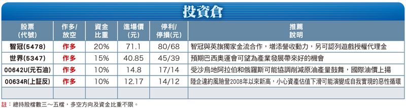 農曆年前夕,大盤走勢疲弱,法人站賣方居多,只是股價跌深了也會反彈。這一段時間以來,全球經濟充滿了不確定因素,開始令人懷疑黑天鵝是否再次出現,果然如此,則台灣經濟進入衰退,該如何因應?投資人該如何避險?可能是長假後必須注意的話題。不過農曆年後慶祝行情是有機會的,只是要小心可能是曇花一現,才是投資人該面對的困境。智冠(5478)旗下研發子公司智樂堂自製《霹靂傳奇》,授權國內手遊大廠台灣英旗EFun平台營運,估計月營收可達一億元,智冠與英旗為獨家金流合作,除了為營收增添動力外,智冠也可認列遊戲授權的代理金和營收分成,為第一季營運增添力道。另外,智冠自去年與大陸百度進行IP合作,由百度將自家遊戲平台上有營運爆發力的遊戲數據提供給智冠,智冠評估可以套用到哪些自家IP,再交由中國研發廠商進行遊戲開發,遊戲開發完成後,由百度獨家取得通路渠道的權利,智冠則是經營大陸以外的市場,今年將持續開案,三方合作的效益今年可望發酵。世界(5347)對於今年營運展望,第一季與同業所預估的相近,目前供應鏈庫存已經消化得差不多,客戶也在進行補庫存。預估隨著奧運逐漸接近,第二季電視需求將成長,也將帶動大尺寸驅動IC出貨增加。