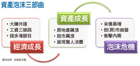 然而,從歷史經驗得知,這類「暴發戶」型的資產上揚,由於過程中牽涉到太多人性貪婪與恐懼的角力,以及金融體系(包括地下金融)過度貸款的風險,因此雖然發生的國家與區域各有不同,但最後,都是以崩盤收場。當銀行體系面臨因房地產或股市崩盤所導致的大量呆帳時,不僅會衝擊到銀行的生存,更會殃及企業的籌資管道,畢竟當銀行都自顧不暇時,對放款企業「抽銀根」便成了銀行自保手段,但後遺症就是加速企業營運衰退。此外,股市與房市的崩盤,對一般大眾而言,將產生財富大縮水的結果,進而影響「消費」與「投資」的意願,甚至引發通縮,日本失落的二十年就是如此而來。近期中國汽車銷量連續數月意外出現負成長,也可視為內需開始衰退的一大警訊。除了正常銀行體系的不良放款問題之外,中國本身還有「影子銀行」的潛在危機。