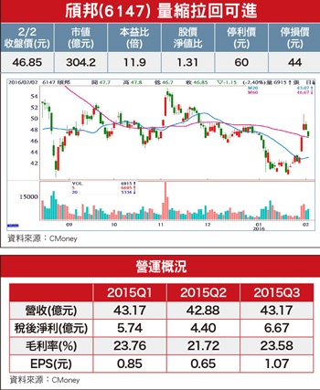 頎邦(6147)是全球第一大驅動IC封裝公司,全球市占率接近五成,受惠於IT面板庫存調整接近尾聲,去(二○一五)年第四季IT面板及驅動IC出貨逐漸回溫,加上4K2K TV價格持續下滑,4K市場滲透率將自去年的一五%至一八%成長至二五%,而4K面板所需的驅動IC是Full HD的二倍,以此推估市場需求,目前頎邦產能將不敷使用,亦即產業面將出現供給缺口,加上合併的欣寶可望在今(二○一六)年達到損益兩平,今年頎邦成長力道將十分強勁。去年第三季合併營收四三.一七億元,稅後盈餘六.六七億元,EPS為一.○七元。十二月營收一一.三六億元,較二○一四年十二月衰退二二.五六%,也較上月衰退一八.一八%。全年營收為一六八.六三億元,較二○一四年衰退四.六四%。頎邦是蘋果iPhone視網膜面板驅動IC封測代工廠,去年下半年接單來源,以手機面板驅動IC封測,以及iPhone 6s的壓力觸控封測訂單為主。 面板驅動IC經過去年的水位調整,市場庫存終於落在安全水位之下,同時大尺寸面板庫存也出現見底跡象,上游面板驅動IC廠接單轉強,頎邦一月已接到急單,第一季營運可望回升。此外,看好在市場新機款推出、4K普及率提升,以及奧運賽事促銷備貨帶動下,今年營收可望逐季攀升,近期法人已有回補跡象,股價有機會走出波段行情。操作建議:四二.六元以下完成小底結構,股價快速急拉,暗示籌碼清洗乾淨,短線衝高後會有拉回,建議投資人,量縮回測四十五元頸線可伺機布局。