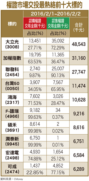 二月一日、二日兩個交易日權證占大盤比重都降至二%以下,一是代表越來越多投資人具有時間價值概念,想避開長假減少的時間價值;另一個是近期國際局勢詭譎多變,台股十幾天沒開盤,不知道部位在這段時間的變化方向究竟會受到什麼影響,乾脆年後再布局。本周權證市場前十名和前兩周有著相當不同樣態,已從明顯偏空態勢回到較為中立的看法。除了大立光(3008)、聯發科(2454)等因客戶成長趨緩或營收不如預期,認售還是比認購來得熱門外,不少從底部反彈的標的吸睛效果顯著,如F-譜瑞(4966)法說後,市場普遍給予正面評價,認為第一季平板客戶需求增加帶動,主要營收成長動能來自非蘋NB eDP滲透率和eDP1.2轉eDP1.3滲透率提升,優於往年。潤泰新(9945)布局業外多角化,獲利成長動力來自三大引擎:業外轉投資南山人壽大賺、中國大潤發貢獻及房地產本業去年起邁向完工認列高峰。去年營收首度站上一三○億元大關,改寫歷年新高。年假期間可觀察國際情勢變化,及思考新的一年投資標的間的消長,在方向較有把握之時,權證低金額高槓桿的優勢,絕對是可以納入賺紅包錢的投資工具之一。