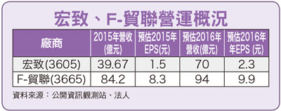 三大主軸拚營運大成長宏致原本是以筆記型電腦連接器為主,尤其是電腦內部的板對板連接器,宏致的競爭技術更是業界領先,而為了研發更精密的技術,二○一○年九月,宏致開始建構精工中心,二○一一年十月,精工中心廠房完成建設、精密設備開始進駐新廠,並於二○一二年一月舉行落成典禮及新廠正式啟用。汽車市場是宏致相當看好的領域,尤其是車用電子,因此二○一一年開始便大舉投入資源,加速車用連接器布局,有鑑於中國汽車市場龐大,但自有品牌車廠在選擇供應商時,還是會以當地廠商為主,因此宏致在二○一四年第四季投資大地電氣二八.三五%股權,並透過受讓大地電氣大股東持股,以及參與大地電氣現金增資等方式,將對大地電氣的持股比重拉高到五五%,公司預期,第一季可望正式將大地電氣併為宏致子公司。特斯拉概念股F-貿聯獲利好宏致董事長袁万丁也設定,包括個人電腦、消費性電子及汽車將是今年三大營運主軸,其中在大地電氣成為宏致子公司後,由於大地電氣二○一五年營收約一八一元,公司預估,大地電氣今年營收年增率將從二○%起跳,也將帶動宏致汽車營收比重大幅躍升。F-貿聯則是特斯拉(Tesla)電動車連接線組獨家供應商,另外也供應特斯拉超級充電站的控制箱線束,受惠於客戶出貨量成長,F-貿聯二○一五年營收也來到八四.二億元,再創歷史新高,同時獲利也可望同步走高,法人預估,EPS將達八.三元,是F-貿聯獲利首度超過八元。法人指出,F-貿聯除了將搭上特斯拉繼續衝刺中國市場商機外,隨著中國政府也將電動車設定為重點發展產業,目標二○二○年要達成五百萬輛,這樣的數字相對於一般汽車來說雖然不多,不過F-貿聯具有技術優勢,加上中國要加速電動車普及,還是需要借助外力,因此F-貿聯雖然並非中國當地廠商,仍可望切入供應鏈。除了電動車產品出貨穩定成長外,F-貿聯的擴充基座與擴展延接裝置,客戶拉貨也優於預期,加上電動車電池管理、冷凍貨櫃、儲能裝置、光通訊模組、醫療束線等產品出貨也相當穩定,都將是推升F-貿聯後續營收及獲利成長的來源。