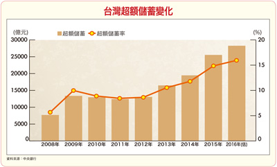 國外資金存量滿溢,國內亦是同病相憐。由中央銀行近期公布資料顯示,台灣二○一五年存款總額達三十九.三五兆元,全體貨幣機構總放款餘額僅二十九.三九兆元,代表還有近十兆新台幣躺在金融體系裡沒人借,「放款/存款」比連降三年達七四.七%,金融機構還有二○%的揮灑空間(存款準備率均值約五%)。二○一五年台灣的超額儲蓄約二.八二兆元,再創歷史新高,超額儲蓄率估計約落在一四.八一%左右。我國的國民儲蓄率已連續五年逾三○%,二○一五年更升至三四.九九%,創下民國七十八年以來新高,儲蓄毛額也首度升逾新台幣六兆元。主計總處預測今年我國消費、民間投資成長率皆低於二%,儲蓄率將再攀升至三五.七%,而超額儲蓄率更升至一五.九三%,續創民國七十七年以來新高。結論是二○○八至二○一五年,台灣整體國民已累積了十二.一兆元的超額儲蓄,按此速度,二○一六年底將達十四.九二兆元。超額儲蓄如此快速成長,確實是一大隱憂,為將超額儲蓄引導至實體經濟,行政院也已經擴大編列今年度的公共建設預算,較去年成長一三.一%,接下來就看執行力了。全球目前景氣能見度並不高,加上干擾經濟成長的變數增加,使投資人投資獲利的難度持續拉高,台灣目前有利的是民間資本存量充沛,這是未來新政府團隊可善加利用的資源之一。下屆總統蔡英文於一月二十八日提出上任後將積極推動五大創新產業,包括綠能科技、亞洲矽谷、生技醫療、國防航太、智慧機械。以目前世界經濟整體概況而言,生技醫療是最不受景氣循環影響的產業,主要原因當然就是人口結構因素。