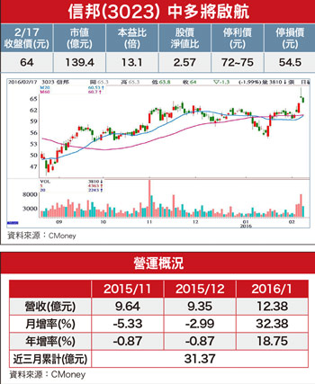 信邦(3023)是連接線組及連接器製造商,以連接線組裝及連接器製造與代理為主,連接線材營收約八七%,連接器代理約七%。信邦近年持續擴充產品應用領域,目前已涵蓋健康照護一一%、汽車九%、綠能二一%、工業二八%和通訊三一%等「MAGIC」五大領域,加上去(二○一五)年導入物聯網、倉儲機器人和航太等新產品線後,又進一步升級為「iMAGIC」,營運成長更為多元。信邦去年營收達一二二億元,創歷史新高,EPS上看四.五元,今年元月合併營收一二.三七億元(月增三二.三%),不僅再度改寫歷史新高,而且比之前的單月營收紀錄足足多出一四%,顯示成長力道強勁。信邦在航太相關零件布局已久,去年與捷克商RayService a. s.簽訂投資意向書,在苗栗成立「睿信航太股份有限公司」,其中,位於中國江陰市的工廠已正式通過認證,生產的信號線及機艙用線已開始回銷給捷克合作夥伴,苗栗廠則在認證中,隨著相關產品布局效益顯現,未來五至十年訂單穩定成長可期。此外,信邦智能電網傳獲歐美客戶五至六億元訂單,為今年成長新動能。另外,航太相關產品預計下半年進入量產出貨,主要供應波音及空巴等知名大廠。展望今年,信邦利基型產品競爭力強,除了風能及工業控制需求依然強勁外,在智能電網及航太二大領域加入下,營運動能可望更上一層樓,值得中期布局。操作建議:股價以六十元為軸心,震盪整理近三個月,由於成交量沉澱得相當乾淨,搭配一月營收優於預期,中多結構即將啟動,可伺機逢低布局。