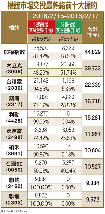 避開過年期間全球股災,開紅盤後迎接的是指數站上季線的格局,從權證進出前十名也可看出僅有大立光(3008)一檔認購、認售成交相當,其餘幾乎一面倒向認購。一掃年前投資人不想持有權證而被吃掉時間價值的心態,隨著指數緩步走高,權證占大盤比重從一.三七%一路上升到二.五四%。說到推升指數,一定不能漏掉占權值很大且近期股價持續走高的台積電(2330),其封關前召開董事會,擬定今年每普通股配發現金股息六元,為一九九七以來最高紀錄,發放總數高達一五五五.八億元,創台股史上新高,加上台積電十六奈米製程效能遠優於三星十四奈米製程,預期全球主要使用先進製程廠商皆將使用台積電十六奈米製程,可望推動其第二季營運成長。本周新進榜的聯鈞(3450)在GPON需求增溫,客戶晶粒產能增加帶動下,業績持續向上,一月營收再度攻頂達六.九四億元,連四月創新高。從市場統計資料來看,在方向較有把握之時,利用權證低金額高槓桿的優勢,是日漸被廣為接受的方法之一。建議投資人做好資金控管,祝福大家都能像孫悟空七十二變一樣,靈活的將獲利更有效率的放入口袋中。