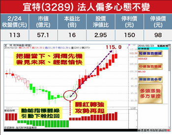 宜特(3289)主要利基題材有:(1)財報報喜,二○一五年全年獲利達三.二五億元,年增近五成,EPS七元,並較二○一四年EPS四.七八元大成長,營收、獲利及每股純益同步改寫歷史新高。(2)元月營收一.八四億元,月增一.○七%,年增一○.九六%,創歷年第三高,主要受惠台灣總部智慧型產品檢測驗證、材料分析接案持續暢旺,以及大陸子公司在可靠度驗證與故障分析接案量持續增加,帶動集團整體營收在淡季中仍表現亮眼,今年持續看旺。(3)面對紅潮來襲,方興未艾的併購風潮,宜特表示,不僅檢測訂單不受影響,由於宜特早在十多年前進軍大陸市場,乃是大陸半導體檢測的先驅,早已佔得市場一席之地,也順勢搭上中國紅色半導體供應鏈成長的大趨勢,今年營運可望更上一層樓。(4)在車用檢測上,去年七月與全球最大汽車安全鑑定與檢測機構歐商DEKRA合資成立「德凱宜特」,跨足車聯網檢測驗證大商機,下半年開始貢獻獲利,全面啟動宜特車電檢測驗證能量。隨著全球車市復甦大成長,去年美、中新車銷量同步改寫歷史新高,歐洲也創六年新高,更將是可望帶動公司營運持續高度成長的主要動能之一。此外,在物聯網少量多樣的研發開案需求下,宜特開春已在台北市內湖成立OTA(Over-the-Air,空中下載技術)無線訊號測試實驗室,將為長線營運增添新動能。操作建議:低接不追高,守穩月線關卡不破,逢低於十日線附近仍可留意低接布局機會,或可參見「財神系統」之多空訊號進行短線價差操作,設好停損停利。