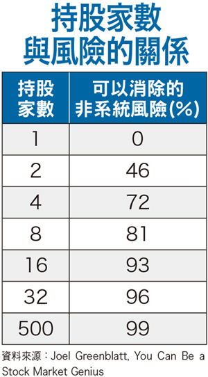 另一方面,美國股神巴菲特在過去四十八年間(一九六五年至二○一二年),創造出平均每年一九.八二%的複利報酬率,乍看之下雖然不起眼,但也只需這一九.八二%的報酬率,就足以讓原本十萬元的資金成長到五.八七億元,完全展現「複利,是人類第八大奇蹟」的投資箴言。以巴菲特為師的投資報酬率,是慶龍長期以來自我的期許,但尋找更高境界的績效水準,也是慶龍不斷再精進追求的努力目標,其中,葛林布雷(Joel Greenblatt)的選股邏輯,給了我一些啟發。稍微簡單介紹葛林布雷的相關背景,他是美國哥倫比亞商學院的教授,同時也是戈坦資本投資(Gotham Capital)創辦人,最令世人津津樂道的,就是他在過去二十年期間,創造出平均四○%的報酬率,遠遠勝過巴菲特的投資績效。過去,慶龍在投資組合的規劃上,也曾參考過葛林布雷的研究心得,他認為:只買一檔股票無法分散任何的非系統風險,但若持有兩檔股票,就可消除四六%的風險,若提高到四檔股票,七二%的風險可被消除,提高到八檔,將減少八一%的風險;再者,投資人一次買進五百檔股票,九九%的非系統風險都可被消除。換言之,投資人只會面臨到系統風險。從非系統風險來看,四至八檔的持股已經降低了七二%~八一%的風險,但就投資組合的報酬,仍會產生一三%~二五%的差異,他指出,若大盤的預期年化報酬率為一○%,持有五檔股票,一年後約有三分之二的機率投資報酬率會落在負一一%~三一%之間,而持有八檔股票的投資組合,一年之後,報酬率有三分之二的機率會落在負一○%~三○%之間。換言之,即使投資組合中少了三檔股票,但五檔股票與八檔股票所降低的非系統風險,其實差不了多少。上述的觀點,也支持慶龍認為一般投資人最適合的持股數量,應落在五檔,因為這將會是「風險」與「報酬」之間最佳的平衡點。