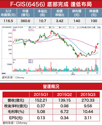 業成F-GIS(6456)是鴻海集團旗下,蘋果供應鏈的壓力觸控商,主打MegaSite一條龍營運模式:整合觸控顯示器貼合、LCD模組及背光模組相關製程,使客戶物流簡化,並能提升良率、降低成本。營收比重為:平板七四%、手機二二%、其他(筆電、AIO PC等)四%;主要客戶為蘋果(用於平板電腦),占營收比重逾八成,產品銷售區域美國七○%、台灣一一%、中國一四%、其他五%。二○一五年估EPS約七.四七元。第一季是傳統淡季,主要是蘋果新舊產品空窗期,不過,非蘋陣營已開始拉貨,加上第一季iPad Pro和iPad Air出貨預估不減反增,可望挹注F-GIS第一季營收,今年EPS挑戰十元。業成原為蘋果iPad供應商,去年首度打入蘋果手機,拿到iPhone 6S壓力感測器訂單,iPhone 6S的3D壓力觸控訂單原由F-TPK獨家供應,現在則由F-TPK、F-GIS分食,可見良率方面F-GIS有後來居上之姿。此外,業成在非蘋陣營也大有斬獲,順利切入大陸小米、華為供應鏈,在度過第一季淡季效應後,第二季起營運動能可望加溫。費時四年的「鴻夏戀」若能修成正果,則受益最大是業成:鴻海入主夏普後除可取得夏普氧化銦鎵鋅(IGZO)技術外,更有助獲得更多蘋果訂單,其中以業成受益最大,因為蘋果的壓力觸控供應商原本由F-TPK及業成分食,未來業成占比可望提升。操作建議:百元以下建構完成為期一個月的圓弧底型態,二月二十四日帶量突破頸線一百元,正式宣告多方掌控全局,由於量能開始放大且投信布局動作積極,股價有機會再次挑戰一四○~一六○元套牢區。