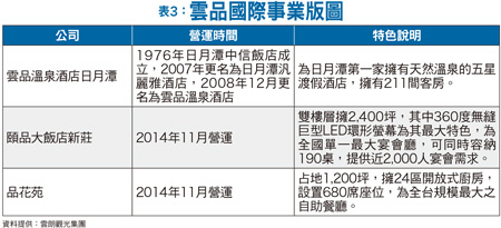 雲品是雲朗觀光集團小金雞雲朗觀光集團總經理兼雲品國際董事長盛治仁去年十月剛參加羅馬大飯店的開幕活動,而今年二月也對外宣布,目前正在興建中的「雲水之都」,預計今年第二季可完工,因此,在年底前可對外開幕。相對於晶華麗晶集團以大樓型飯店的拓張形式,雲朗觀光集團因為執行長張安平偏愛古堡式的飯店經營型態,因此,可以發現,除了羅馬大飯店因位於市區外,其他包括「聖莊」、「嵐莊」及「蓉莊」,房間數都不多,幾乎是走頂級精品住宿的等級。盛治仁表示,雲朗觀光集團自二○一三年起,陸續在義大利各地經營莊園,因此,未來海外的拓點,也會以歐洲為優先考量點。而針對雲朗觀光集團旗下有不少飯店品牌,繼雲品國際之後,有沒有可能推動其他品牌上市櫃?盛治仁表示,「不排除」,但目前最優先的是在年底前,雲品國際能從興櫃轉上市。盛治仁表示,雲品國際旗下有雲品溫泉酒店、頤品新莊大飯店、品花苑等三大事業體,其中,餐飲、營收占比為六四比,去年新增新莊據點,全年營收十二.二三億元,年成長率高達九一.四二%,而今年一月營收一.三九億元,年增二一.一%,持續成長(表三)。他更透露,為了衝轉上市後的業績表現,目前也極力洽談三個餐飲新據點,他談到,台北地區的餐飲商機無限,相較於不少飯店同業爭相開設「館外餐廳」,他坦言,快速複製成功的餐飲品牌,對業績將有爆發性的助益。此外,針對晶華麗晶集團「輕資產重管理」,獲得不少開發業者委託他們代為經營管理飯店,多了「委託經營」的業務,盛治仁也談到,雲朗正打算切入市場,以求事業布局的多元化。