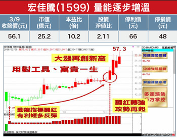 宏佳騰(1599)產品外銷占九○%以上。主要利基題材有:(1)獲利啵棒:三輪重機開賣,以及ATV(沙灘車)代工新增山葉(Yamaha)等新客戶帶動,去年營收攻上二七.六五億元,年增一四.五九%,創歷年新高,前三季EPS衝上四.○九元,已大大超越歷年紀錄,估二○一五年EPS上看五.五元,將較二○一四年一.五元大幅成長。(2)開春報喜,營運催油門:元月營收持續繳出二.○五億元亮眼成績,月增六七.六一%,年增三五.三%,且受惠北美ATV市場持續成長、山葉代工下單量看增,以及國內提升高單價的三輪重機銷售,並規畫赴廣州設機車引擎廠,插旗大陸機車市場,預估今年營運仍將有雙位數高成長可期。公司派表示,目標今年在台機車銷量要再成長三○%上看萬台,受惠黃牌路權開放,宏佳騰重機採親民價格策略,Elite 300E車系也取得同級車款二○%市占率的佳績,未來將持續研發設計並生產價格親民的重機,目標是奪下同級車款三五%市占率,深耕重機族群。(3)因應電動機車發展趨勢,未來可能與Gogoro結盟,開發自有品牌電動機車,物聯網時代來臨,「智慧進化」也是宏佳騰相當重要的製車方向,率先在全車系搭載USB充電接口,未來更將導入智慧科技,例如可連結手機、智慧尋車等功能,隨不同車款導入不同功能,預計第四季就可望有新車款落實科技概念。操作建議:低接不追高,守穩四十八元整數關卡不破,逢低於五日線或十日線附近仍可留意,或可參見「財神系統」之多空訊號進行短線價差操作,設好停損停利。