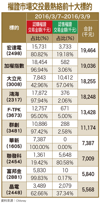 本周在指數延續漲勢中,權證市場仍是方向看多的認購權證交易較為熱絡。另外可以觀察到兩大看點,第一是相對位階較低的股票有諸多投資人進場布局,例如鴻海(2317)、F-TPK(3673)、群創(3481)以及這周反彈明顯的宏達電(2498)。以宏達電為例,若投資人在三月四日大漲放量股價站上年線及所有均線之上以收盤價九十元敲進,到三月九日收盤一○四.五元,漲幅約一六%。但若是以權證的方式進場,三月四日FP兆豐(041817)收盤一.三,至三月九日漲至二.二四,漲幅七二.三%,槓桿倍數約四.五倍,可明顯看到方向明顯時權證帶來的威力。另一個族群是本周因營收或其他新聞而市場稍微偏向負面的,以附表來看就是大立光(3008)和聯發科(2454)。其中大立光公布自行結算二月合併營收二○.三八億元,月衰退三七%,年減二二%,創二十四個月來新低。累計前二月合併營收五二.六五億元,年減二一%。隨著鴻夏戀可望修成正果,大立光潛在競爭對手康達智(Kantatsu)是夏普投股逾四○%的轉投資公司,也將成為鴻海旗下企業,有助鴻海集團光學鏡頭布局,再度引發市場擔憂對大立光的衝擊。