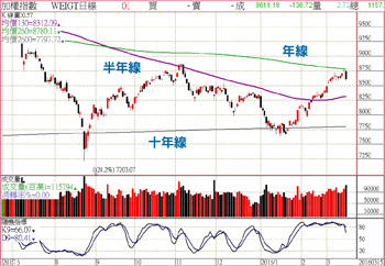 過完農曆年期間(二月十五日至三月十四日),台股漲了十八天,只有兩天小跌,氣勢紅不讓。在凍產協議下,德州輕原油從二六.一九美元飆漲到三八.五一美元,成為推動股市的重要推手。一月至今全球股市平均漲幅一一~一四%,台股從一月十八日七六二七低點到三月十四日八七七七高點,漲了一一五○點,漲幅一五%,居全球股市漲幅前段班。全球景氣除了美國明顯復甦,其餘大多停滯不前,導致各國政府不斷推寬鬆政策,甚至負利率,錢滿為患也是這一波推升資產價格的主因,但漲多後卻需提防回檔及獲利了結盤出現。三月九日歐洲央行(ECB)宣布擴大QE(每月擴大至八百億歐元),降存款利率至負○.四%,造成當天德國股市由大漲二七○點轉為跌二二○點作收,目前市場焦點:三月十五~十六日美國聯準會FOMC會議,是否再升息?將對股市造成影響,強勢美元會造成全球資金板塊移動,同時股市獲利了結盤是否趁機出現,都需注意。台股這波漲勢推手是外資,過年後股票大買一一九○億,同時台指期淨多單累計一度達三九三○一口,創七年來最高,三月十六日台指期結算,外資是否出現調節賣壓是關鍵指標。以技術線型分析:去年八月台股守住十年線後開啟兩波回升,目前上檔大壓力:年線八七八○點。成交量一直無法同步放大,導致要突破年線不易。技術指標:KD、RSI都處高檔超買區,台股提防回測半年線機會存在。