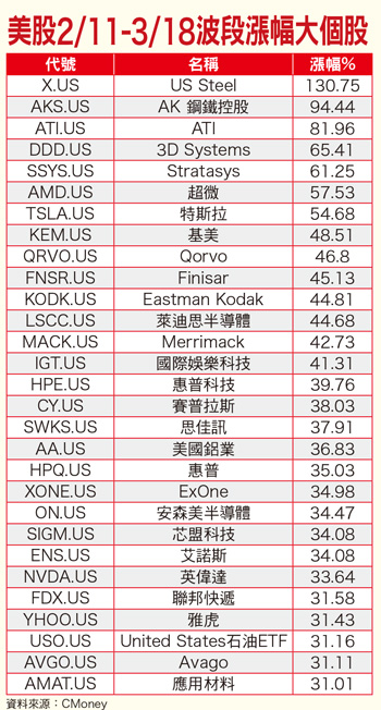 全球金融市場的發展仍圍繞在「錢太多」的主軸,資金滿溢然後被趕來趕去的情況,在美國暫不升息的決定後,更加不易立刻扭轉。股債雙漲,全球被打入負利率的公債續增,美股創波段新高,紐約原油期貨十八日盤中再創反彈新高(四一‧二/桶),游資持續流向各類風險性資產,連高收益債都漲,促使各能源等原物料相關公司趁機發債,借新還舊,讓債權金融機構的壓力得到紓緩,主要商品只剩美元指數大跌,也順勢增加了資金擁抱新興市場的誘因。現階段美國升息的變數可以暫時擱在一旁了,美聯準會(Fed)調降今年升息次數,由去年十二月預期的四次、減為二次,同時下修美經濟成長與通膨預估,今年