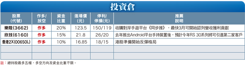 在全球負利率政策下,熱錢不斷湧進台股,外資連續買超台股達十九個交易日,同時作多台指期未平倉多單達四萬口以上,多頭在高檔持續加溫,不過指數變化不大,代表攻擊力道雖然盤中很激烈,收盤卻在箱型整理之中。從近期公布經濟數據屢屢表現不佳,但是熱錢流入台股形成鮮明對比,內資與散戶擔心驚驚漲,重點是如果有基本面帶動的漲勢,可以持續比較久,當資金行情散場時,記得要跑得快。對樂陞(3662)來說,去年是「刻骨銘心」的一年,但樂陞今年在順利完成募資後,可望完成收購對岸手遊平台《同步推》,在完成股權交割後,最快三月即可開始認列《同步推》的營收獲利貢獻,將會是樂陞今年最大的成長動力。至於今年的遊戲推出計畫,北京樂升將推出兩款手遊,子公司磁力線上將推出兩款手遊和一款跨平台遊戲,樂陞母公司的作品為《真.三國無雙》。欣技(6160)去年第四季營收季增四六%,主要是俄羅斯客戶回補庫存,同時有一筆千台出貨量的CP 60手持訊息採集掃描器去年底拉貨的挹注。欣技去年上半年推廣的Android作業系統的手持電腦RS 30系列,已於去年十月份上架、納入銷售,在價格具有彈性,且類似智慧型手機的操作方式,預料今年將吸引更多客戶選購,有助於營運提升。